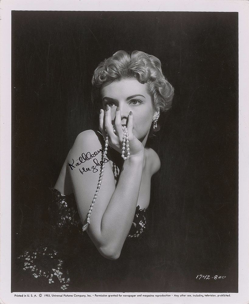 Vintage glossy 8 x 10 Universal Pictures publicity photo of Hughes as Paula Rainer from the 1953 film The Glass Web, signed in fountain pen. Reverse bears an affixed movie caption. In fine condition, with scattered light creasing and wrinkling. From the Harvey and Rhoda Kuflik Collection.