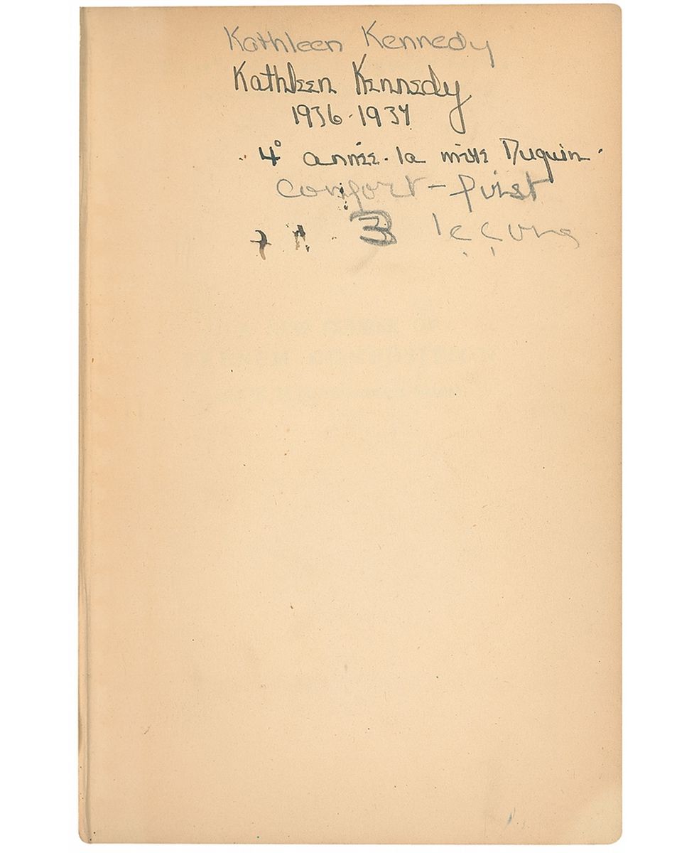 Fourth child of Joseph Kennedy (1920–1948) and sister of John F., Robert, and Edward Kennedy, who was killed in a plane crash in the south of France. Scarce signed school book: French Composition: Book II. Later printing. London: J. M. Dent and Sons Ltd, 1933. Hardcover, 5 x 7.25, 275 pages. Signed on the first free end page, “Kathleen Kennedy, 1936–1937, 4° annee la mille Duguin.” Autographic condition: fine condition, with pencil notations above and below signature and a uniform shade of mild toning. Book condition: G+/None. Green cloth-covered boards; cloth over spine completely detached but still present; edges worn, with several tears in cloth; few interior hinges loose; light soiling; inkstamp and small notes to feps. After graduating from the Riverdale County School and attending the Norton Convent of the Sacred Heart, Kathleen spent a year abroad studying at the Holy Child Convent in Neuilly, France, where no doubt this particular book was of much help.