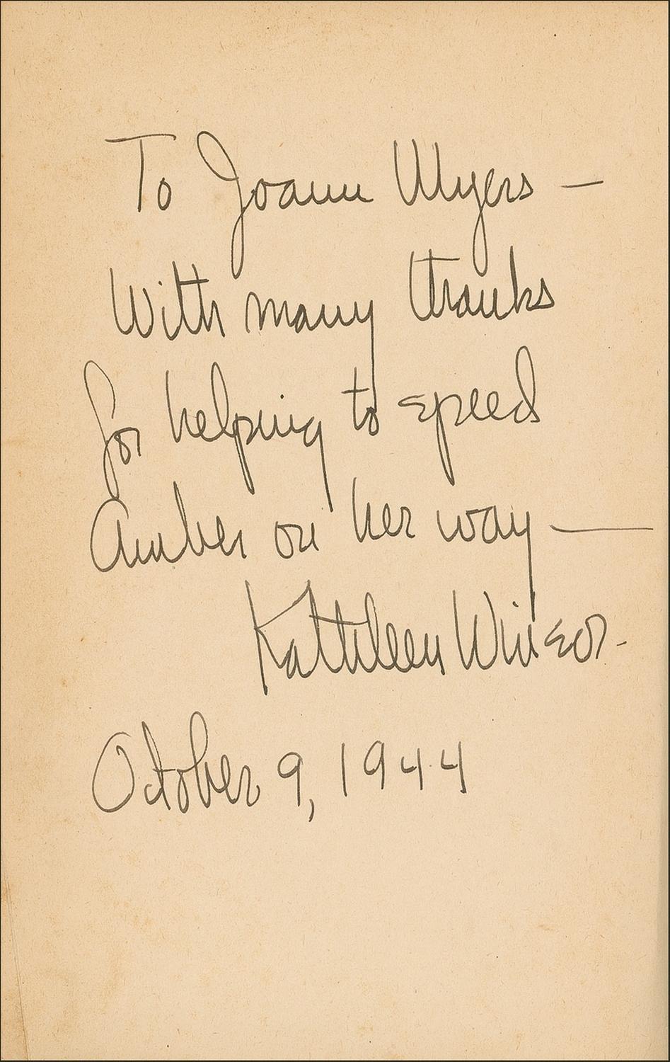 American author (1919–2003) best known for the romance novel Forever Amber, a controversial and allegedly pornographic novel. Signed book: Forever Amber. First edition, first printing. NY: The Macmillan Company, 1944. Hardcover with dustjacket, 6 x 8.5, 972 pages. Signed and inscribed in black ink on the free end page opposite the title page, “To Joan Myers—With many thanks for helping to speed Amber on her way—Kathleen Winsor. October 9, 1944.” In very good condition, with spine lettering rubbed, light fraying at spine ends, hinges slightly weakened, and the dustjacket heavily worn and torn with chipping and a missing front flap and torn back of the dustjacket. Accompanied by an invitation and envelope for a reception in honor of the author and the release of the book, originally presented to John Norris Myers, director of the Macmillan Company and the father of the book’s first recipient.