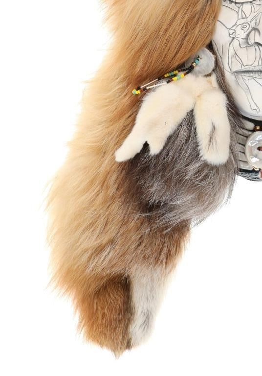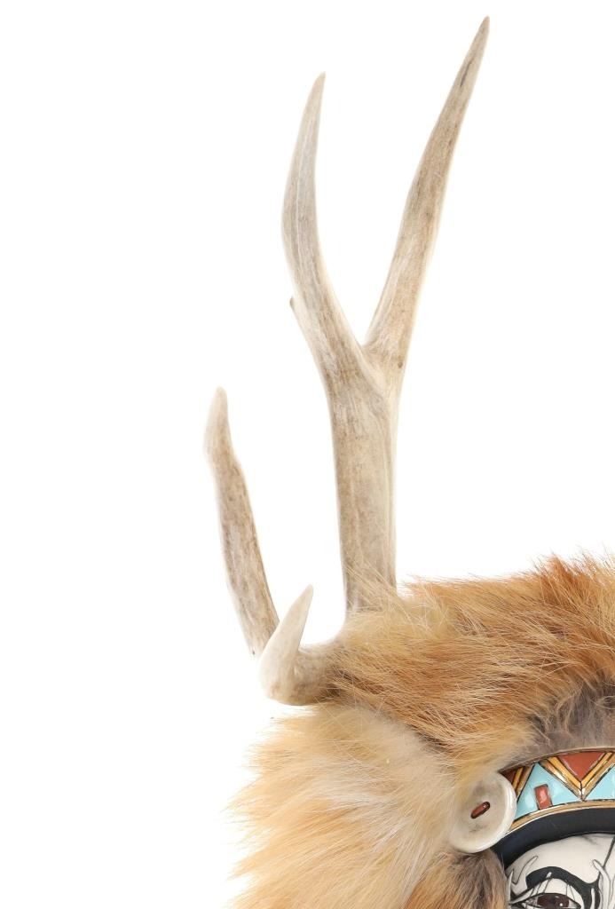 Featured in this lot is this limited edition Cherokee Spirit Mask done by Kathryn Yauney circa 1992. Kathryn Yauney graduated from Nebraska's Chadron State College with degrees in both art and history. She has taught art on the Sioux Pine Indian Reservation and is a member of the Cherokee Nation. Natural South Dakota clay and mixed media are used in Kathryn's handcrafted creations. Beads are mixed with porcupine quills, antlers, horns, and particular furs to create spirit masks and sculptures that depict various facets of Native American culture. This is a limited edition mask numbered 8/45, a scarce piece of Kathryn's work. The mask is crafted from ceramic and features large deer antlers, a real fur headdress, bone earrings and different colored trade beads attached to the bone earrings. Painted on the face is a bull with large horns and red paint smeared over the eye left eye. The face shows great attention to detail and features the artist's signature on the bottom of the chin reading, "Yauney ©92 8/45". The head band shows colors of red, gold, blue and yellow. The bone necklace is shown with accents of gold and red. The piece shows good condition overall with little to no wear present and no signs of obvious damage. Horns are loose. It measures approximately 22" in length, 13" in width and a depth of 10". It weighs 2 pounds and 8 ounces.