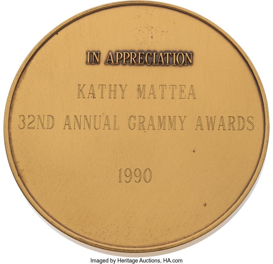 Kathy Mattea Grammy Presenter Bronze Medal (1990).A Grammy presenter's medal, cast in bronze, bestowed to two-time Grammy winner Kathy Mattea in 1990 at the 32nd annual Grammys. Front of medal bears the trademark image of the phonograph and reads, "NATIONAL ACADEMY of RECORDING ARTS and SCIENCES." Engraved inscription on verso reads, "IN APPRECIATION / KATHY MATTEA / 32ND ANNUAL GRAMMY AWARDS / 1990." At this same Grammy Awards, Mattea won Best Female Country Vocal Performance; she also won the Country Music Association's Female Vocalist of the Year award in both 1989 and 1990. Measures 3" in diameter. Comes housed in original box with fitted felt lining. In Near Fine condition. COA from Heritage Auctions.
