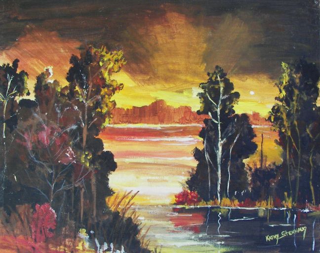 , (6119-4-6) Kathy Stenhaug, Acrylic On Board, Landscape Of A Lake At Sunset, 16" X 20", Signed Lower Right