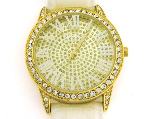 This is a Kathy Van Zeeland Strap Watch w/ Crystal Bezel & Dial with the following features: Round crystal bezel, stainless steel caseback; Roman numeral hour markers; hour and minute hands with luminous inserts; seconds hand; White/Goldtone; Strap with stainless steel buckle; Japanese movement; and Approximate measurements: Band 6-1/4"L to 8"L x 3/4"W; Case 1-3/8"L x 1-3/8"W