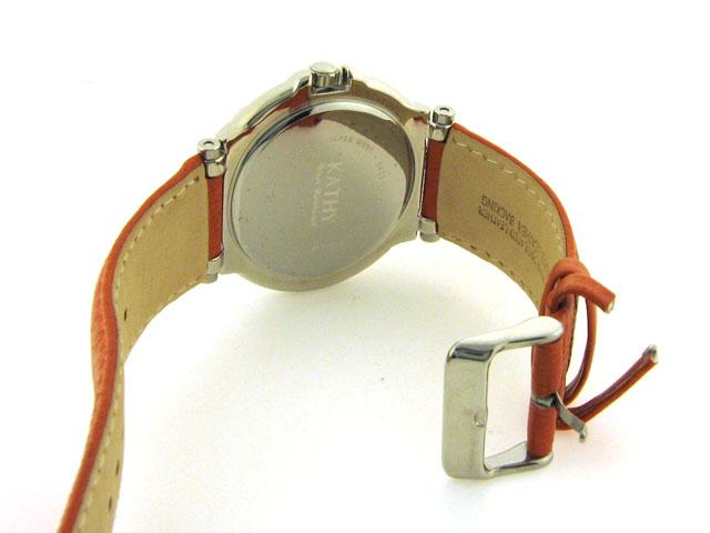 This is a Kathy Van Zeeland with Crystals on Enamel Bezel Watch. Watch features are as follows: Silver tone and Enamel Bezel with crystals; Silver tone and crystal markers; White dial; White/silver tone hands; Leather strap; and Stainless steel case back