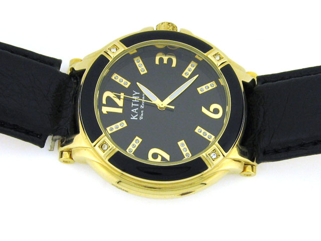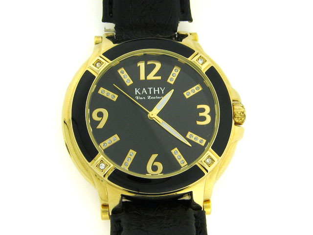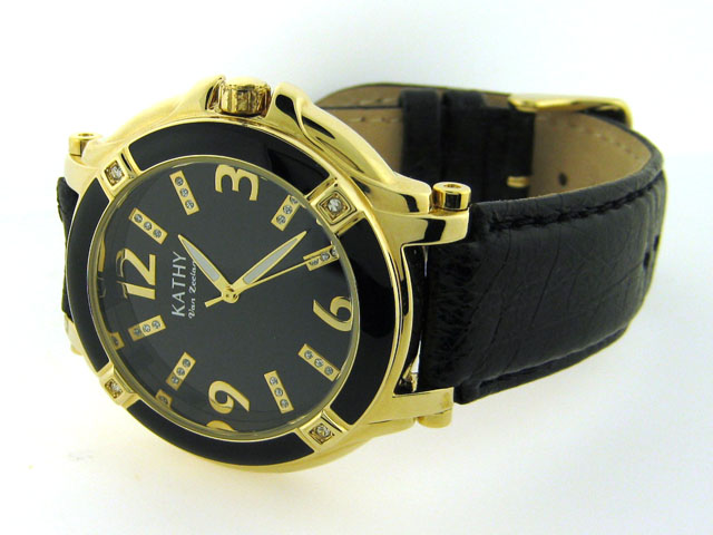 This is a Kathy Van Zeeland with Crystals on Enamel Bezel Watch. Watch features are as follows: Gold tone and Enamel Bezel with crystals; Gold tone and crystal markers; Black dial; White/gold tone hands; Leather strap; and Stainless steel case back