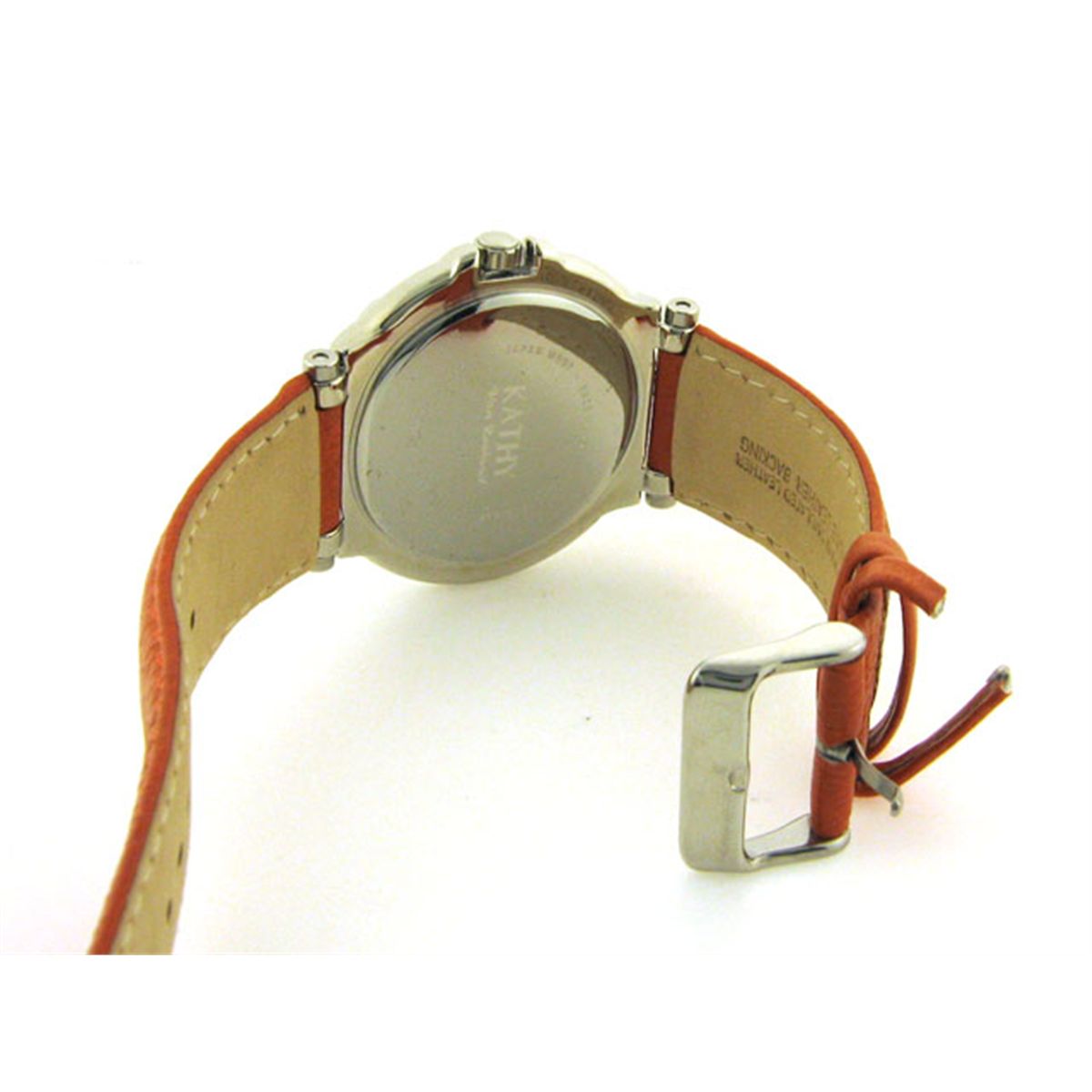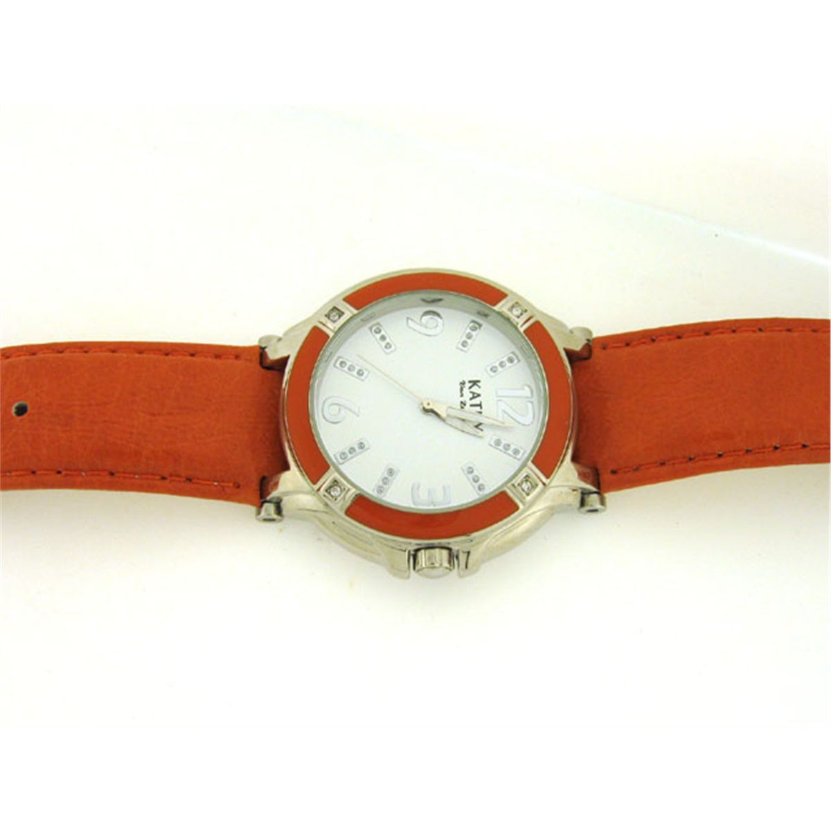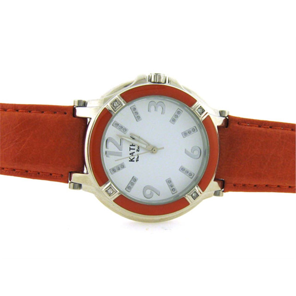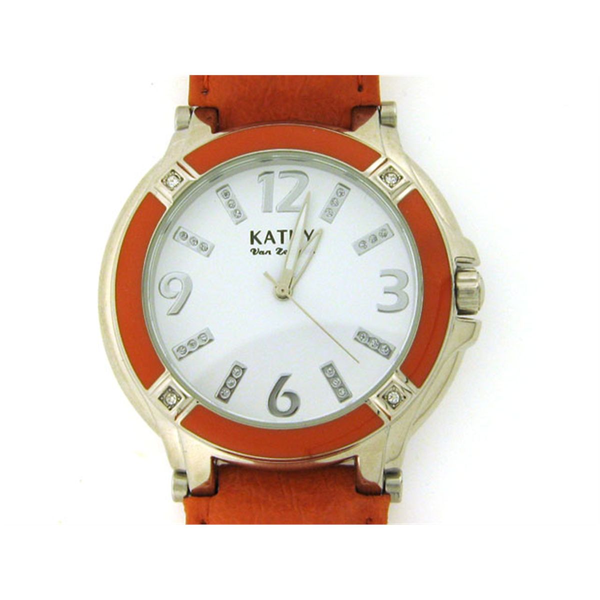 This is a Kathy Van Zeeland with Crystals on Enamel Bezel Watch. Watch features are as follows: Silver tone and Enamel Bezel with crystals; Silver tone and crystal markers; White dial; White/silver tone hands; Leather strap; and Stainless steel case back