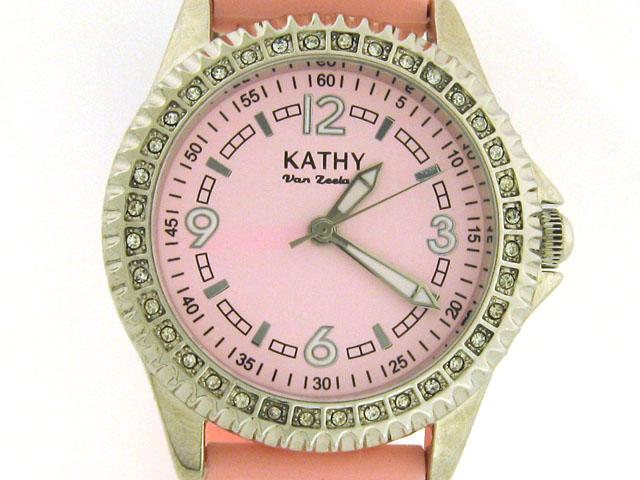 This is a Kathy Zeeland Ladies Watch with Crystal Bezel and Pink Dial. The watch has the following features: Crystals on base metal bezel; Rubber strap; Silver/White tone hands and markers; Push/pull crown; Pink Dial; Stainless steel back; and Japan Movement.