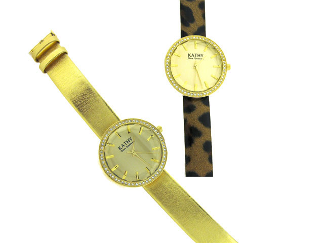 This is a Kathy Zeeland Ladies Watch with Interchangeable Strap. The watch has the following features: 2 interchangeable straps; Gold tone bezel, dial, hands and markers; Crystals on bezel; and Stainless Steel back.
