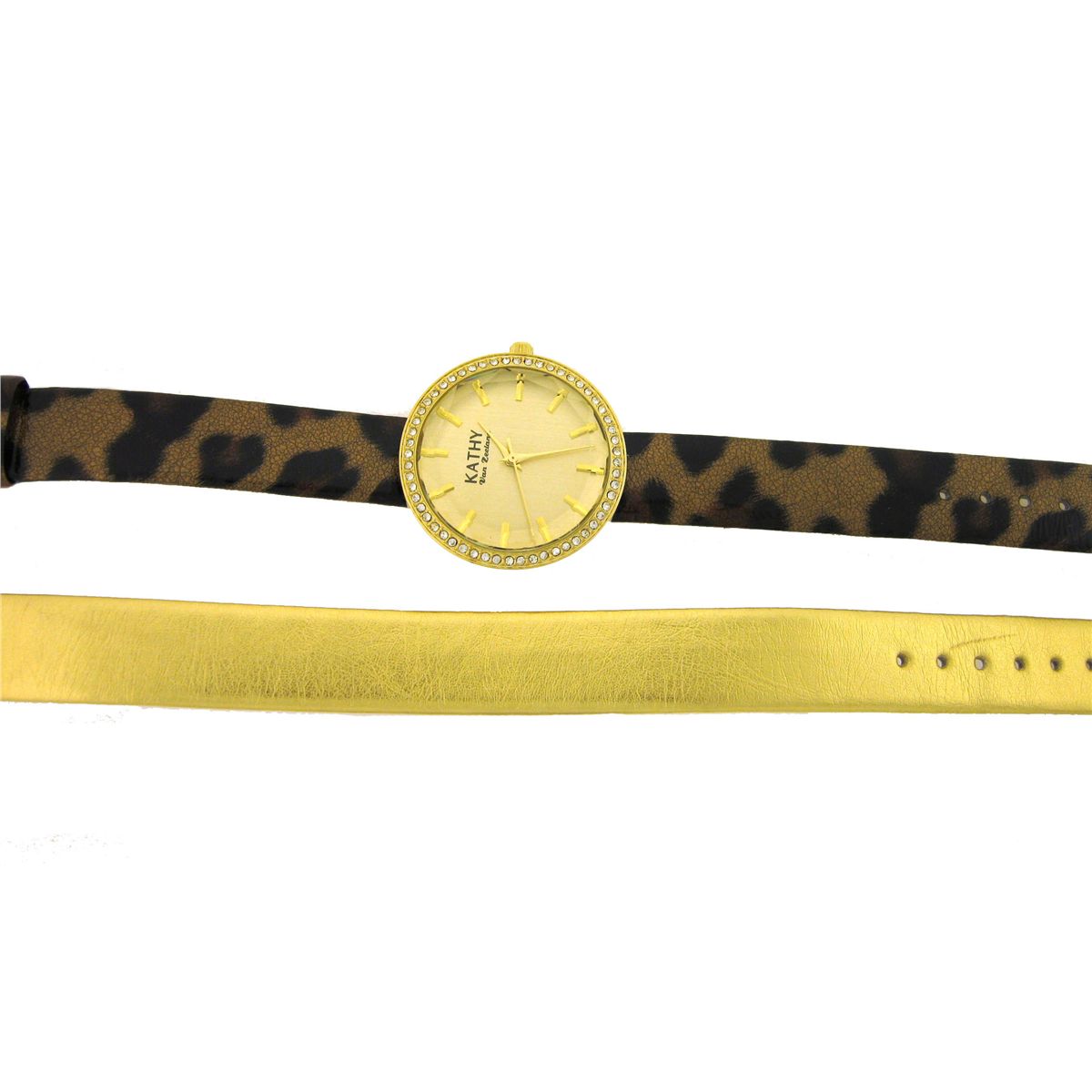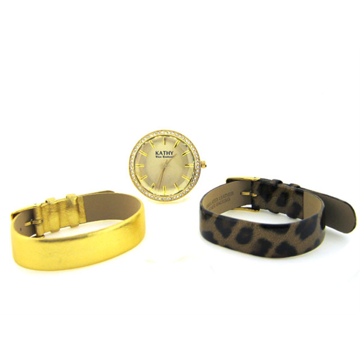 This is a Kathy Zeeland Ladies Watch with Interchangeable Strap. The watch has the following features: 2 interchangeable straps; Gold tone bezel, dial, hands and markers; Crystals on bezel; and Stainless Steel back.