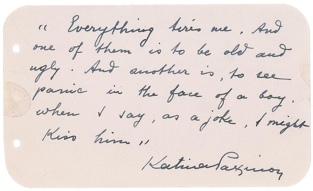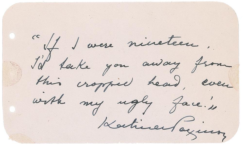 Two AQSs on individual off-white 5 x 3 album pages. Paxinou pens two quotes from her 1943 film For Whom the Bell Tolls. First one reads, “Everything tires me. And one of them is to be old and ugly. And another is, to see panic in the face of a boy when I say, as a joke, I might kiss him.”; the second reads, “If I were nineteen, I’d take you away from this crappie head, even with my ugly face.” In fine condition, with light mounting remnant to vertical edges of each page. Pre-certified PSA/DNA and RRAuction COA.