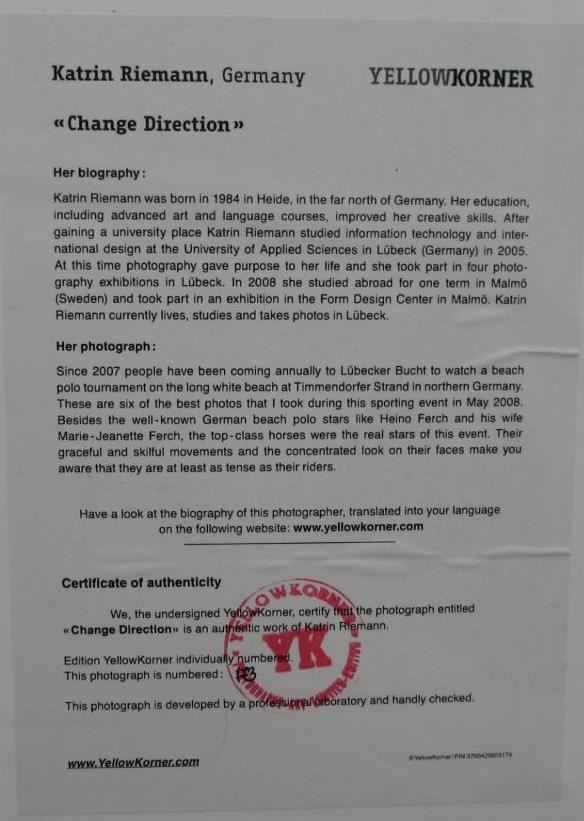 Change Direction Certfied Photograph, Katrin Riemann YellowKorner Certified Photograph. Certificate of Authenticity from YellowKorner affixed to the back. Matted Dimensions 16"x20". Protected with Clear Mylar Sleeve.