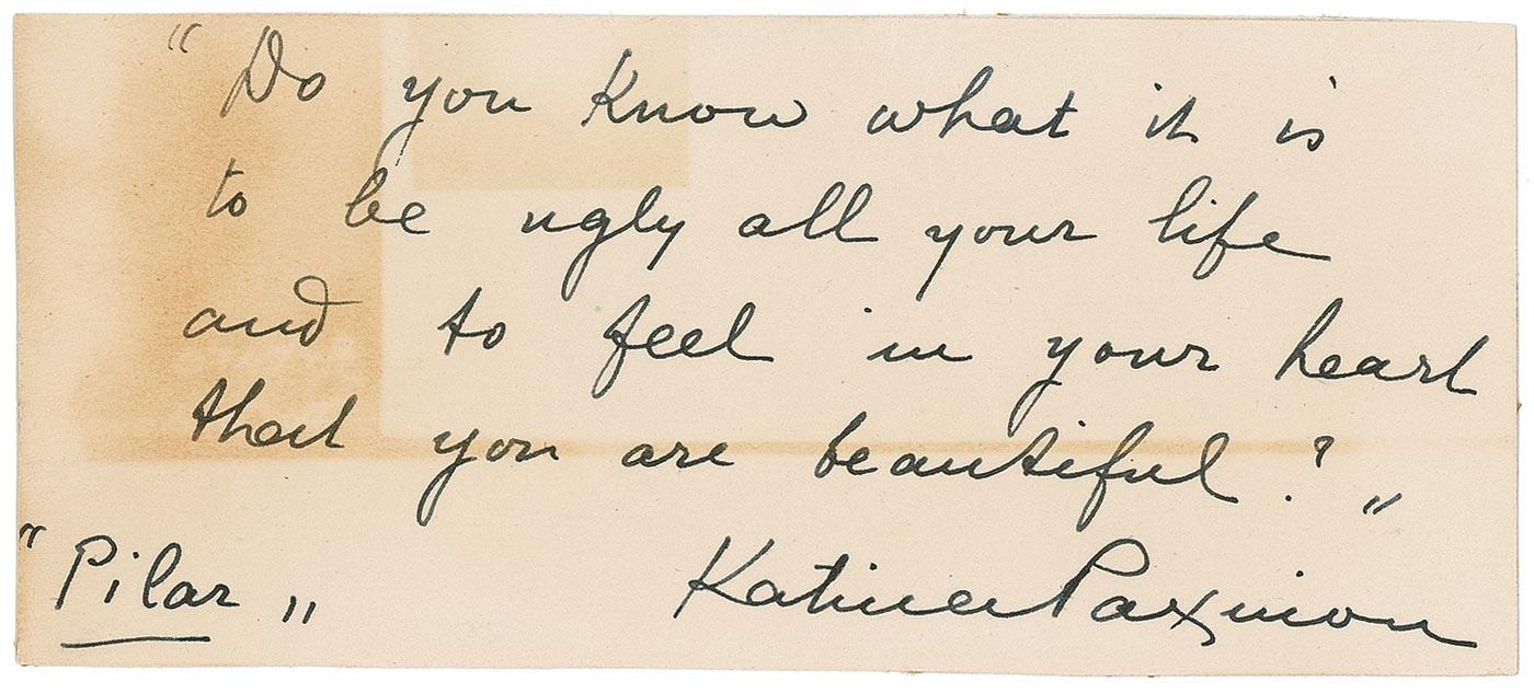 AQS on a trimmed 5.75 x 2.5 card, signed “Katrina Paxinou.” Paxinou pens a quote from her 1943 film For Whom the Bell Tolls. In full: “Do you know what it is to be ugly all your life and inside to feel that you are beautiful?” In very good condition, with scattered toning, not affecting signature.