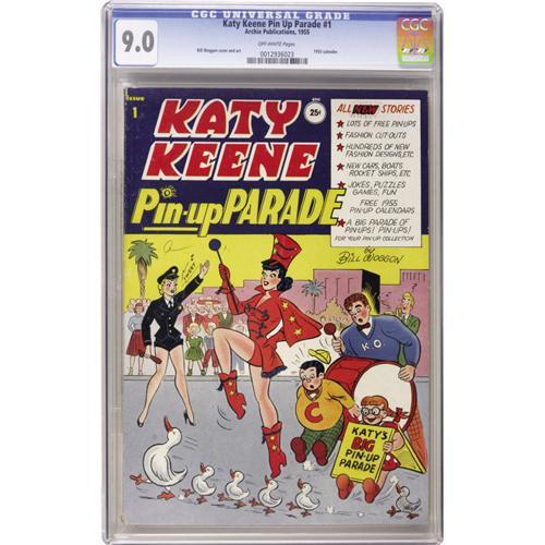 <B>Katy Keene Pin Up Parade #1 (Archie, 1955) CGC VF/NM 9.0 Off-white pages.</B></I> This is the first time we've offered this issue, and this copy barely misses being the highest-graded copy in CGC's current census. Bill Woggon provided the cover and story art. Overstreet 2006 VF/NM 9.0 value = $478; NM- 9.2 value = $650. CGC census 9/06: 2 in 9.0, 1 higher.<BR><BR><b>Shipping:</b> Slabbed Comic (<a target="_blank" href="http://www.heritageauctions.com/common/shipping.php">view shipping information</a>)