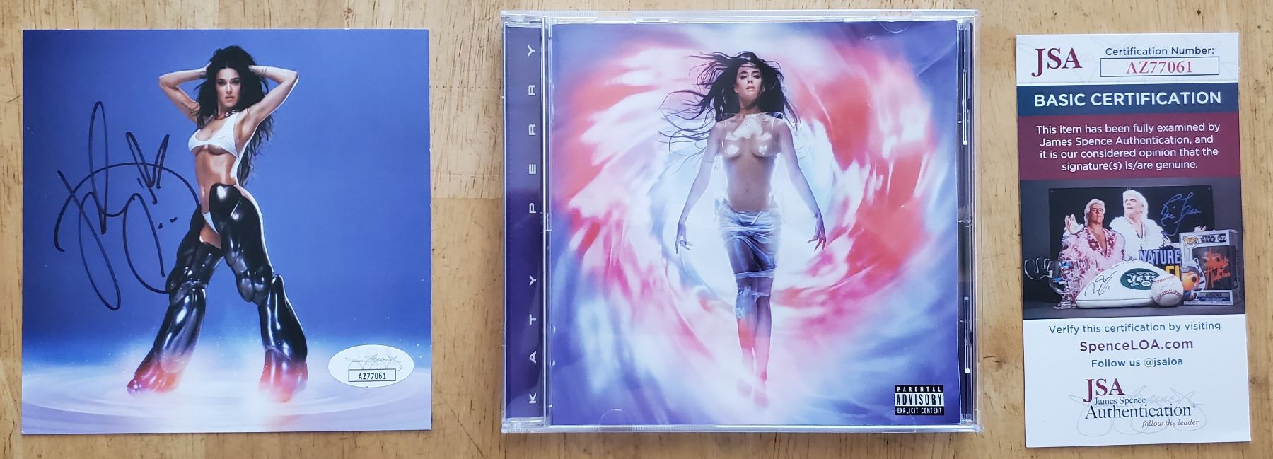 A 143 CD photo insert signed by Katy Perry, with the CD. JSA authenticated the autograph, providing a Certificate of Authentication numbered AZ77061.
