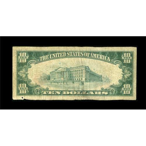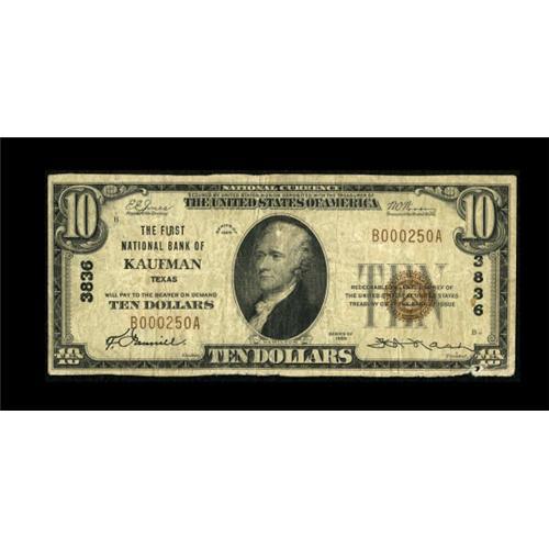<B>Kaufman, TX</B></I> - $10 1929 Ty. 1 <B>The First NB</B></I> Ch. # 3836<BR> This note is one of only nine small in the census. This <B>Fine</B></I> $10 does have a bit of margin roughness in the vicinity of the lower right corner.<BR><BR><b>Shipping:</b> Coins & Currency (<a target="_blank" href="http://www.heritageauctions.com/common/shipping.php">view shipping information</a>)
