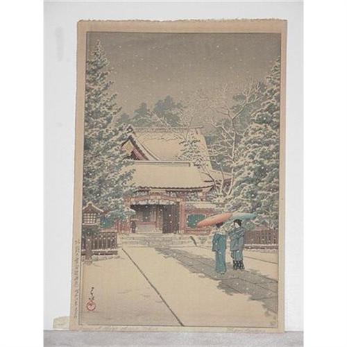 A beautiful Japanese original woodblock print titled "Snow at Hiye Shrine, Tokyo" 1931, by Kawase Hasui, (1883-1957) Known for his exquisite landscape prints, Kawase Hasui was one of the most prolific and talented shin hanga artists of the early 20th century. He designed around six hundred prints total, mainly for the publisher Watanabe Shozaburo, although he also worked for several others briefly. In 1930, with the help of Watanabe, Hasui exhibited 92 prints in the landmark Toledo Museum of Art exhibition, which introduced his works to the West and led to his international recognition as a Japanese landscape print artist. Later, Hasui was recognized for his ability to depict snow scenes. Great Japanese scholars like the eminent Naruzaki Mureshige liked to describe Kawase Hasui as the "Artist of Snow". He became one of the best known artists of the New Print movement and was named a Living National Treasure in 1956.