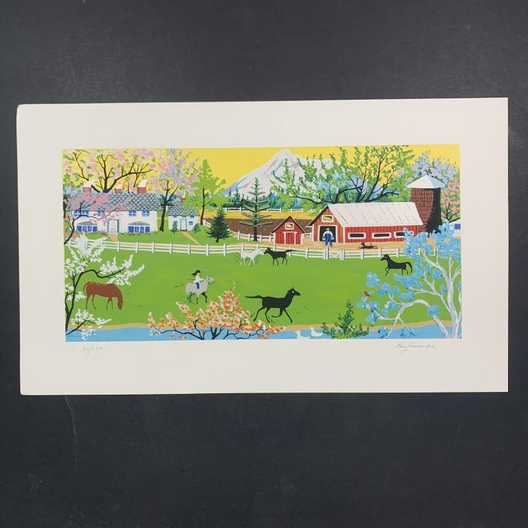 Kay Ameche's "Mt Shasta" limited edition print, signed lower right and numbered 26/250 lower left. This piece is of a farm with horses running about and young girl riding one. This piece is in excellent condition.