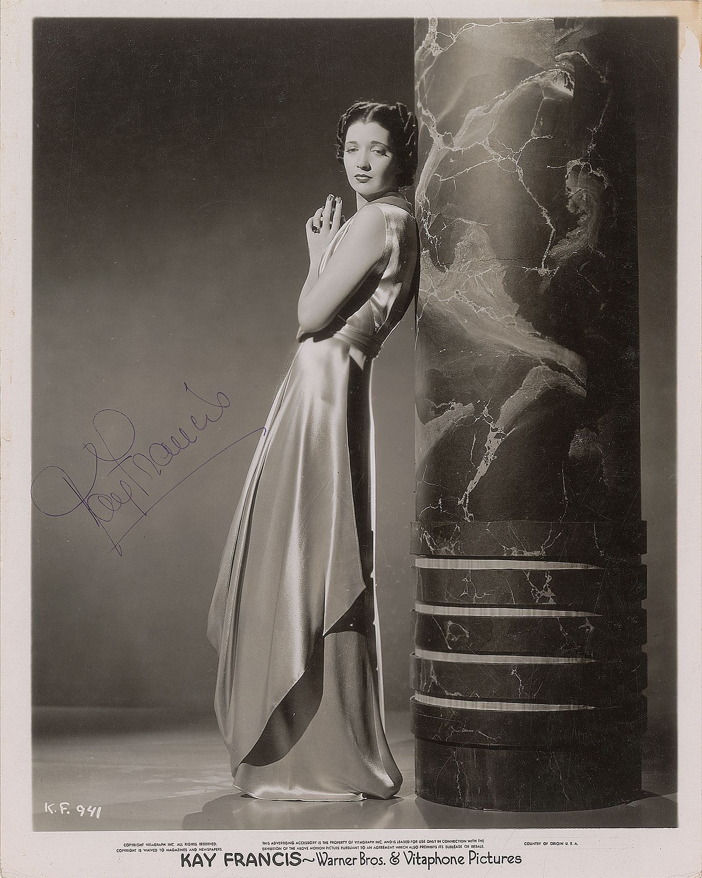 American stage and film actress (1905–1968) who achieved her greatest success between 1930 and 1936, when she was the number one female star at the Warner Brothers studio and the highest-paid American film actress. Vintage glossy 8 x 10 Warner Bros. and Vitaphone Pictures publicity photo of Francis in a full-length pose leaning against a marble column, signed in fountain pen. In fine condition.