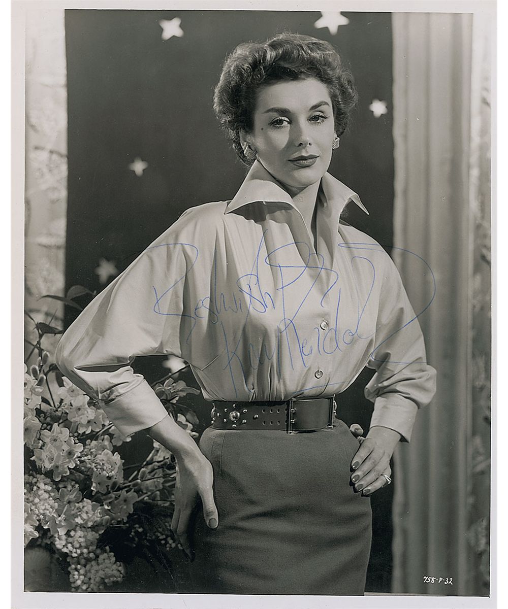 Extraordinary British film comedienne who died from leukemia at age 33 in 1959. Vintage glossy 8 x 10 three-quarter-length photo of Kendall with her hands on her hips, signed in blue ballpoint, “Best wishes, Kay Kendall.” Scattered creases, otherwise fine condition.