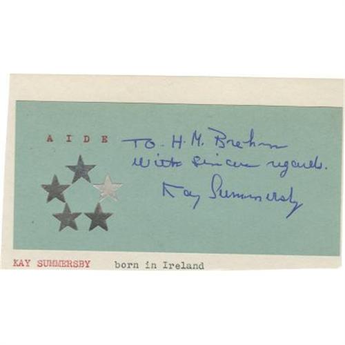 <B>Kay Summersby Signature</B></I> <I>To H. M. Brehm</B></I>, on card, mounted on stiff paper stock, 5.5 x 2.5. Kay Summersby (1908-1975) was Dwight Eisenhower's chauffeur and aide during WWII. It has long been speculated that Summersby and Eisenhower were involved in a romantic relationship but definitive proof has never surfaced. Fine condition. <BR><BR><b>Shipping:</b> Flat Material, Small (<a target="_blank" href="http://www.heritageauctions.com/common/shipping.php">view shipping information</a>\)
