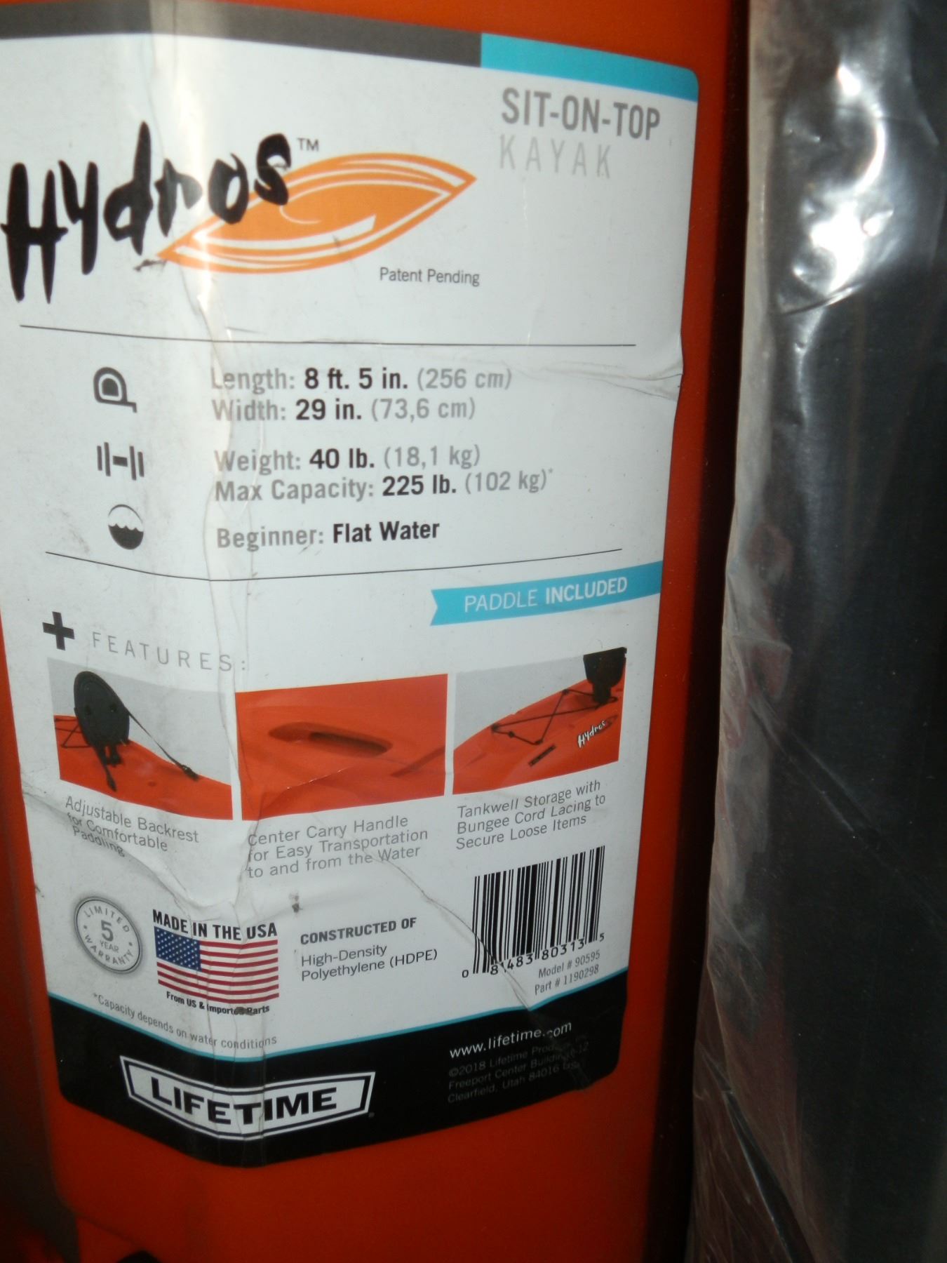 Sit on top Kayak, 8foot 5" Long 29" wide, max capacity 225lbs, for flat water, comes with paddle, in good condition.....