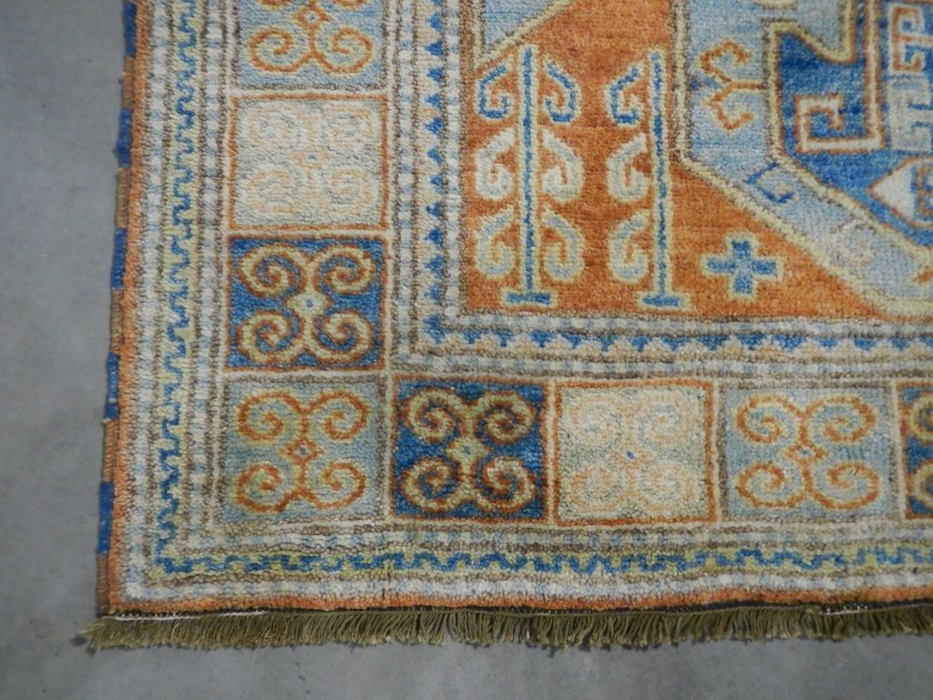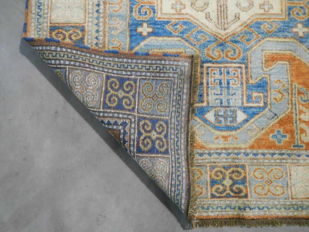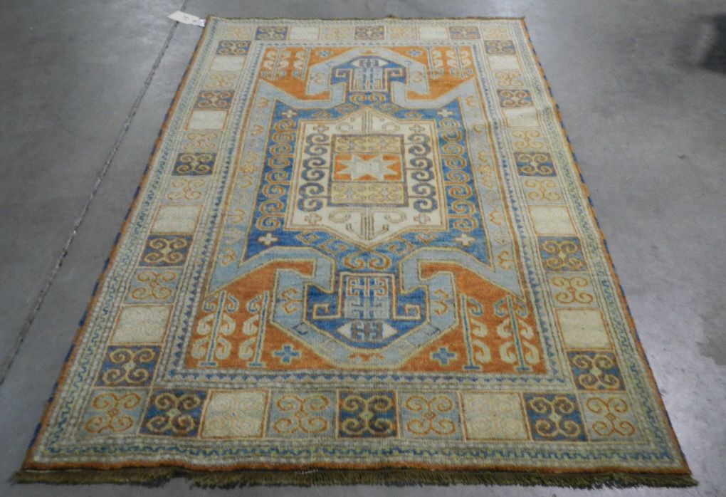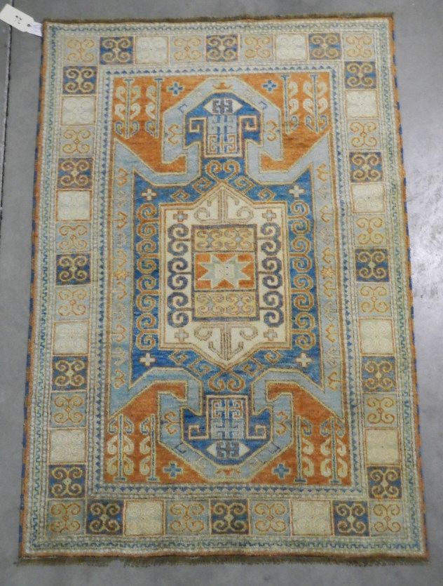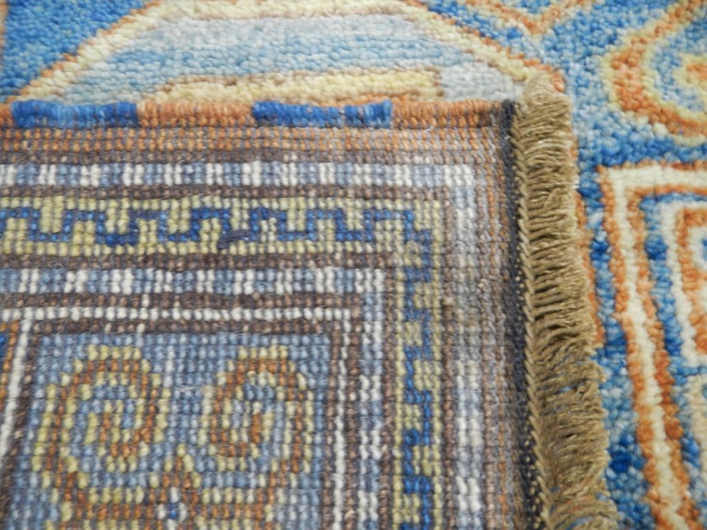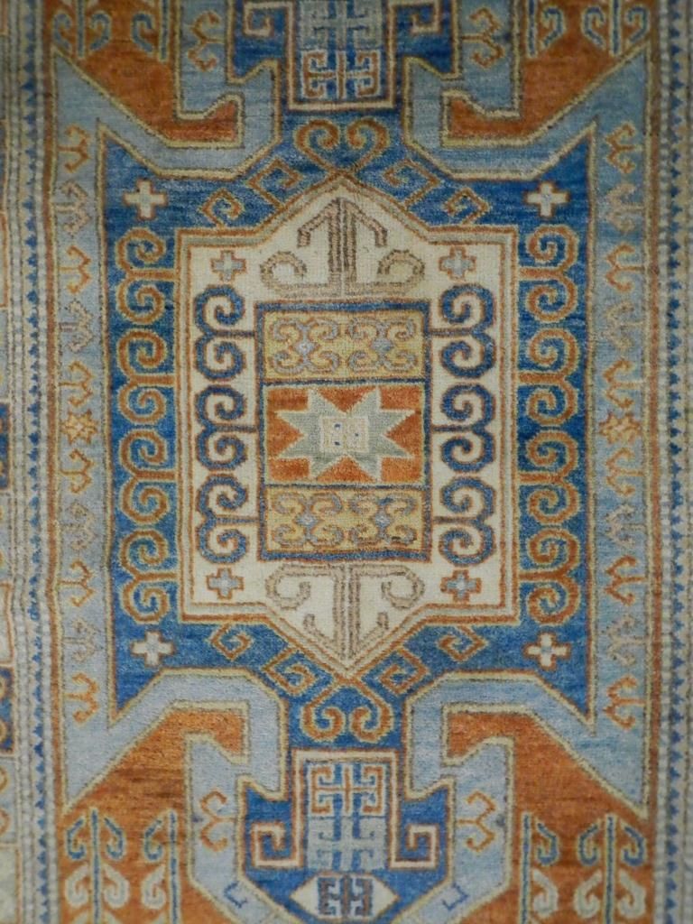 Kazak Rug Hand Woven in India with Color Fast Chrome Woven Dyes. Kazak originated in the Caucasus Mountains. Geographically called Qazax and is a city in Northwest Azerbaijan. 100% Wool Rug. Kazak Pattern. 4.9'x6.10'