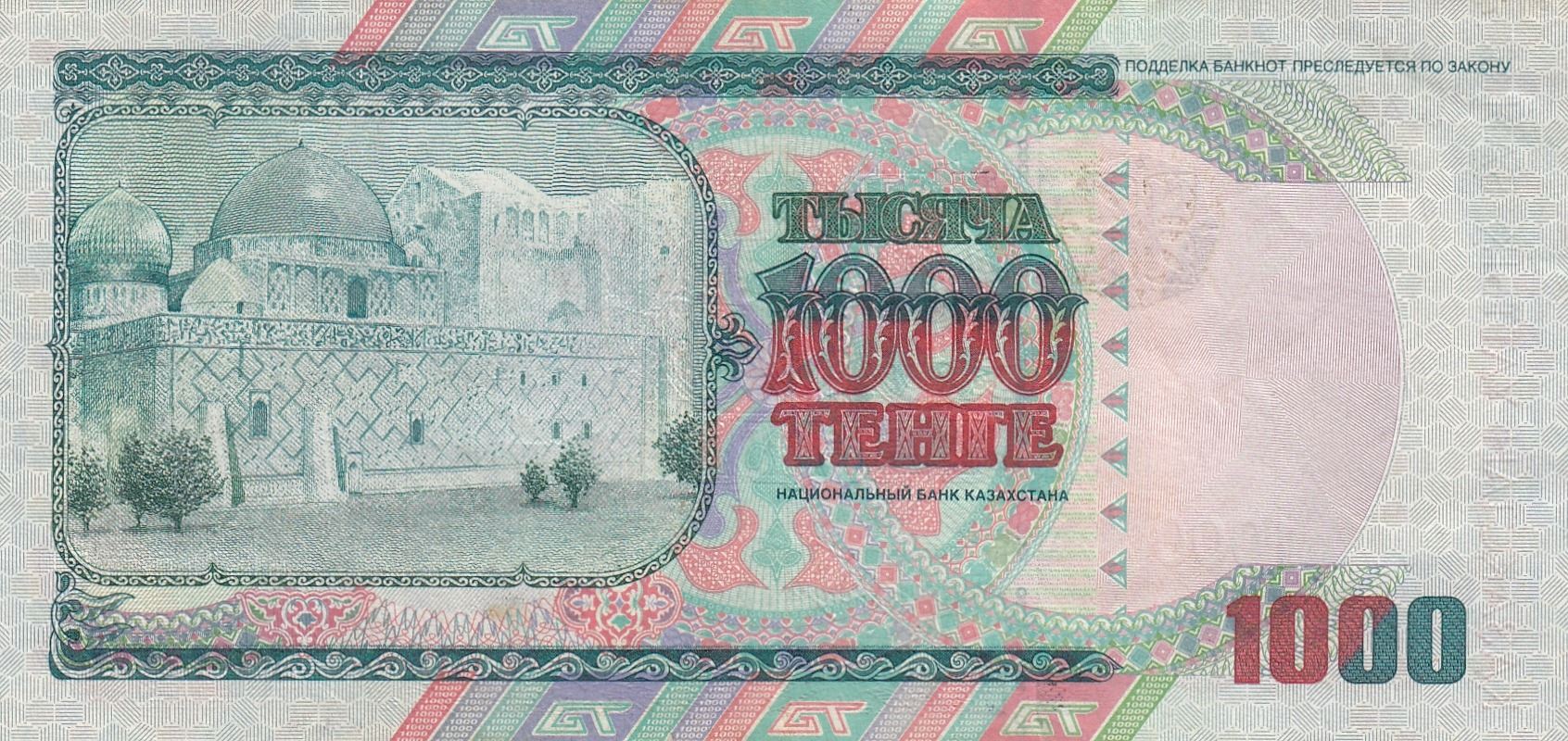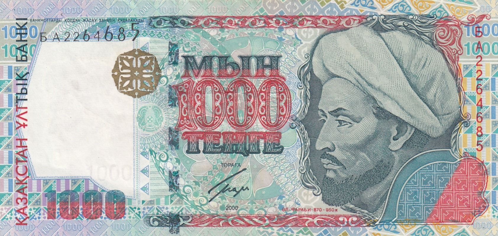 Kazakhstan, 1.000 Tenge, 1999, AUNC (-), p22br/Al-Farabi portrait at right, serial number: 2264685