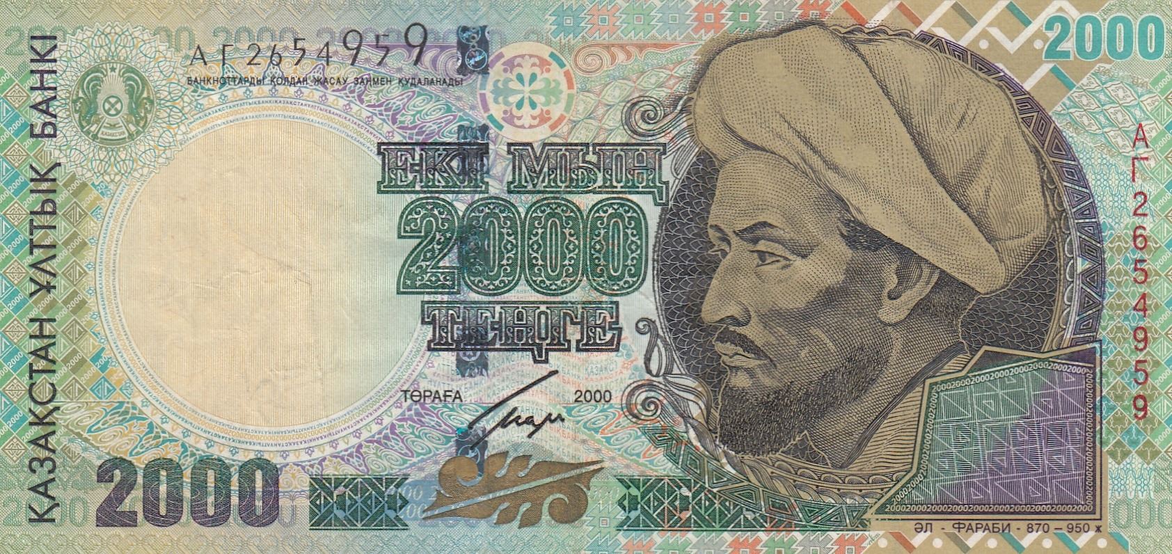 Kazakhstan, 2.000 Tenge, 2000, XF (-), p23br/Al-Farabi portrait at right, serial number: 2654959