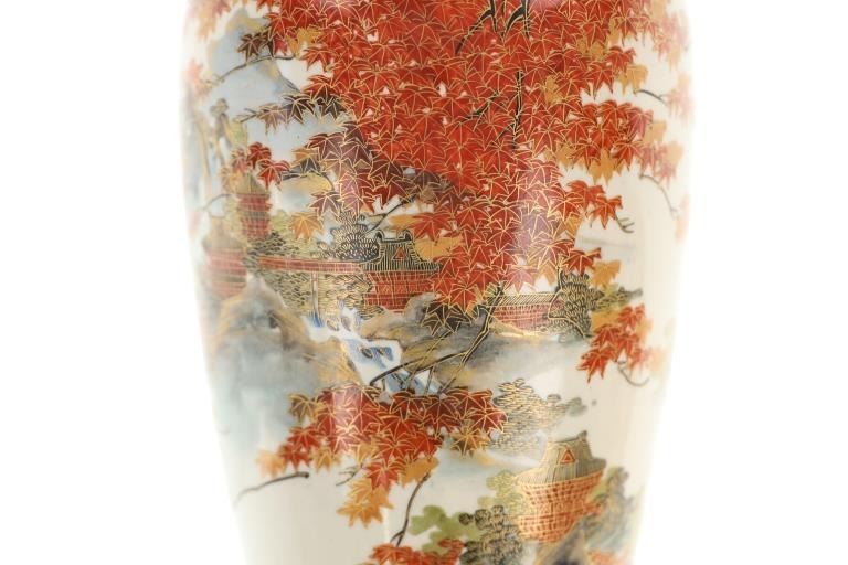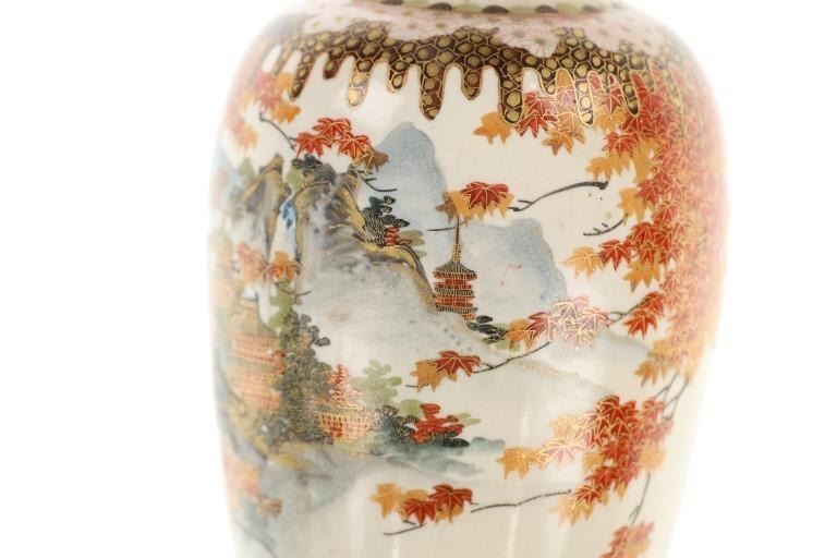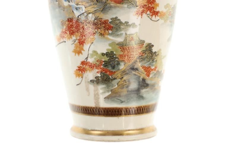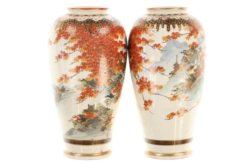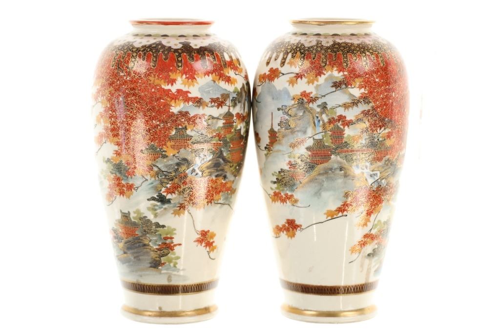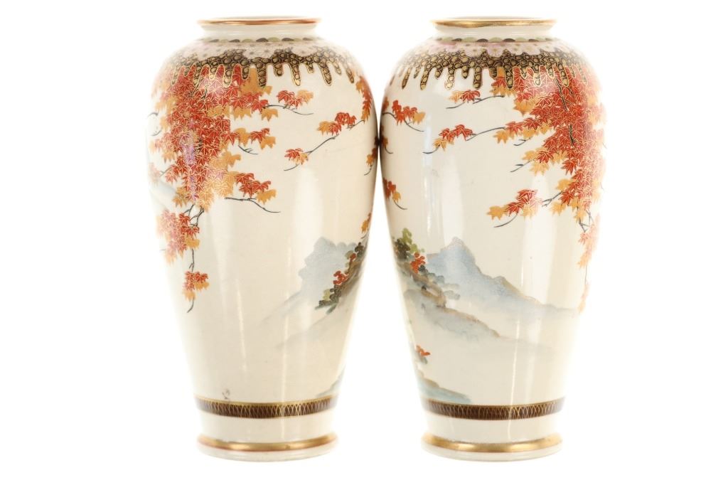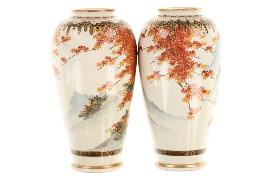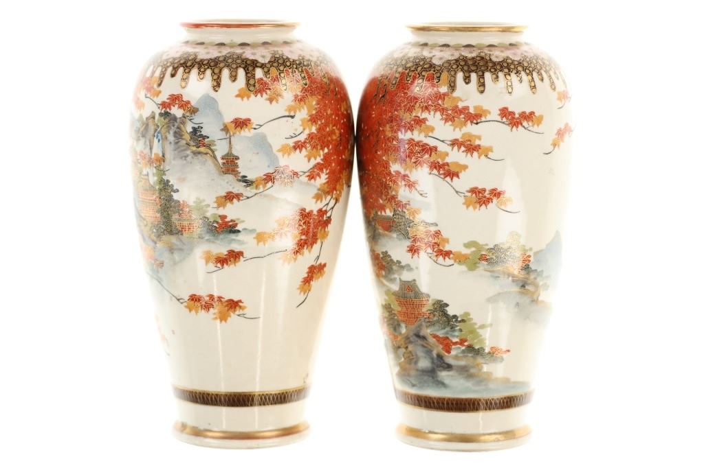 For your consideration is a pair (2) of Matching Kazan Signed Japanese Satsuma Hand Painted Porcelain Vases, Taisho Era, circa 1912-1926, Shimazu crest. Hand-painted cartouche on bottom reads, "Kazan Taisho Period 1912-1926." Pair of Satsuma baluster form vases, gilded polychromatic enamel over glaze designed landscape with temples, mountains, Hogyoku and Red Leaf maple trees and streams/waterfalls against an ivory cream-coloured base. Satsuma ware (???, Satsuma-yaki) is a type of Japanese pottery originally from Satsuma Province, southern Kyushu. These Satsuma vases are in very nice preserved condition, intricate and stunning hand painting. No marring observed, each measures 8.5"H x 4.5"W at widest portion, 2.5" diameter mouth, 3.5" base approx., approx. weight total 2lb.*