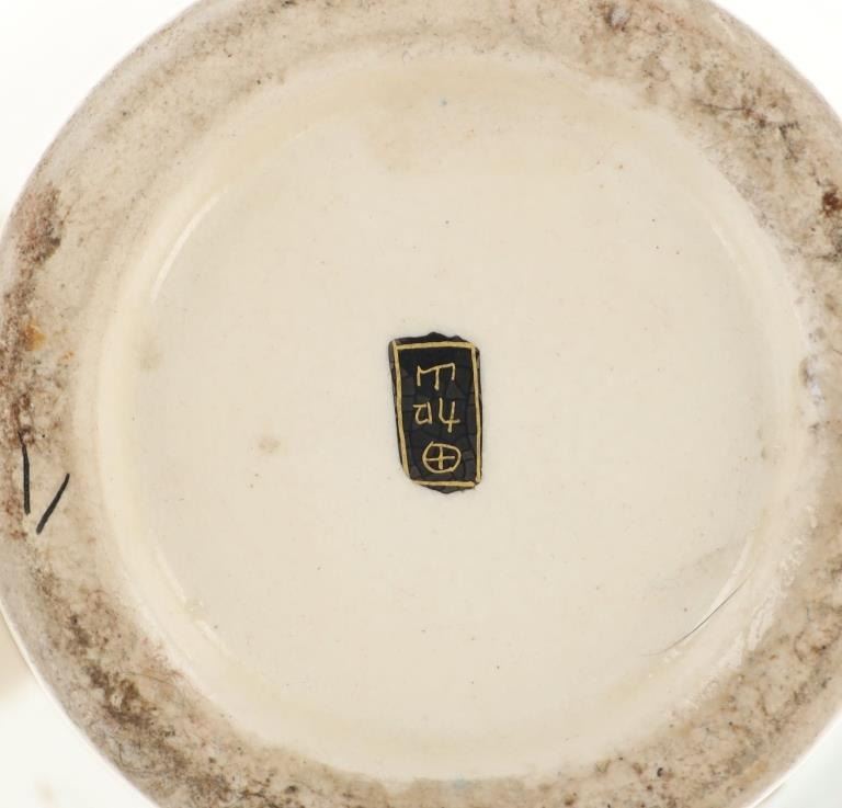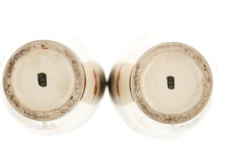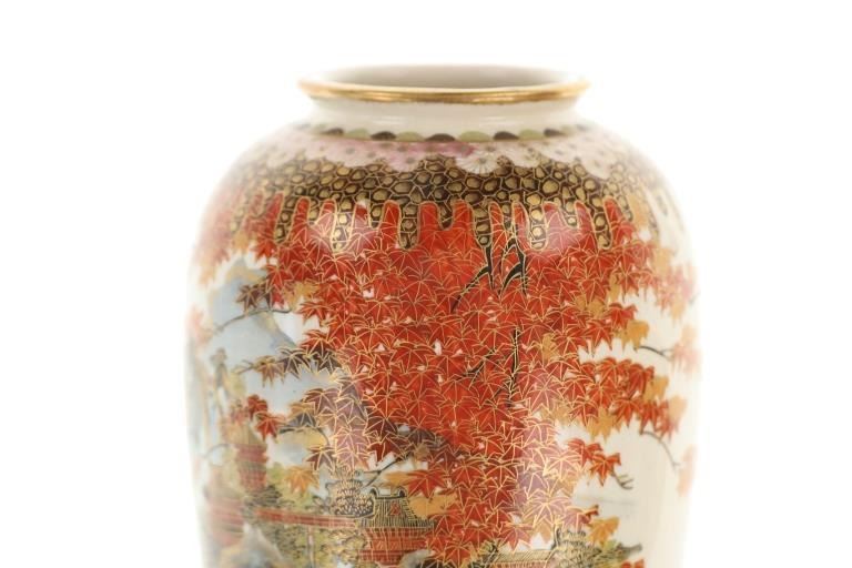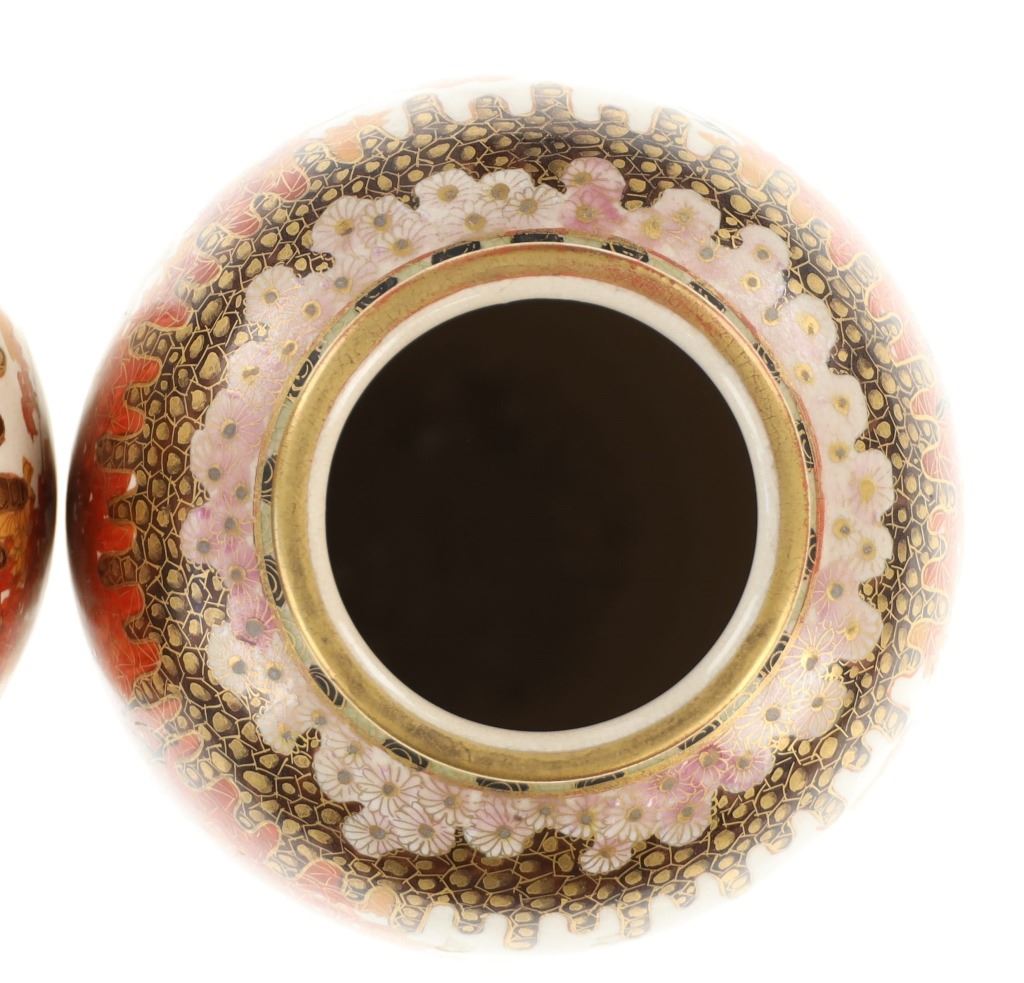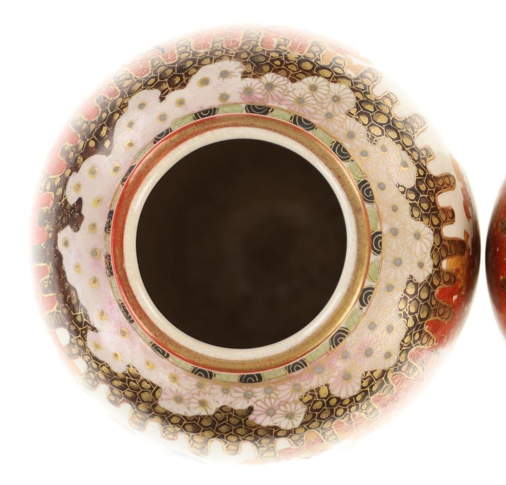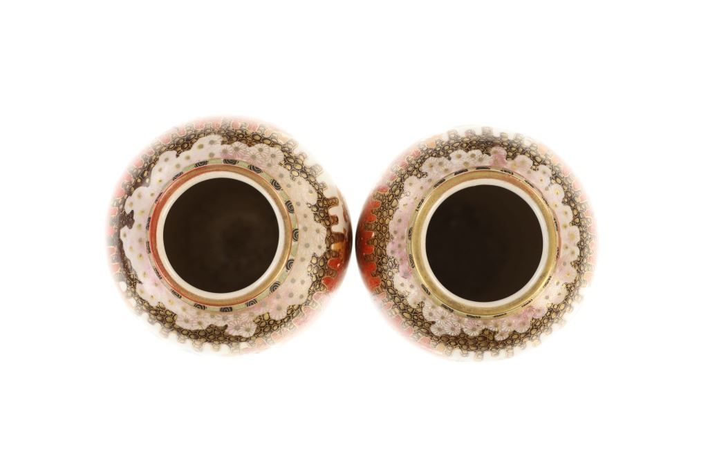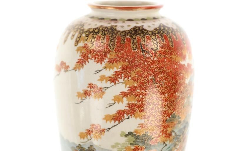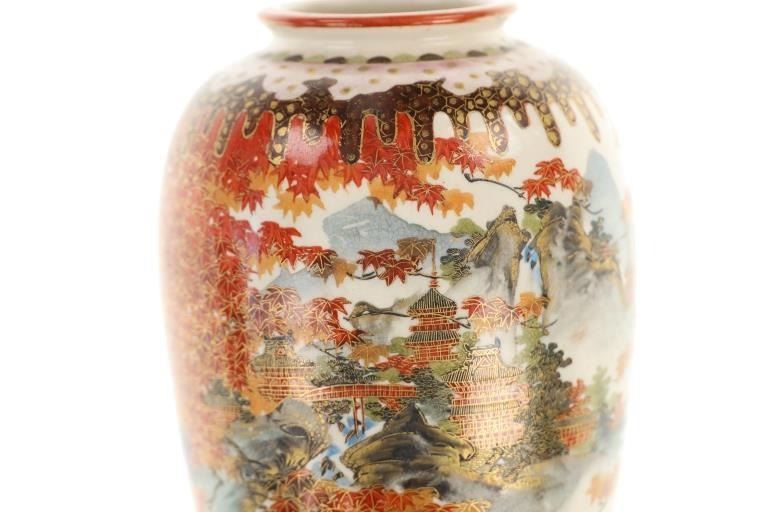 For your consideration is a pair (2) of Matching Kazan Signed Japanese Satsuma Hand Painted Porcelain Vases, Taisho Era, circa 1912-1926, Shimazu crest. Hand-painted cartouche on bottom reads, "Kazan Taisho Period 1912-1926." Pair of Satsuma baluster form vases, gilded polychromatic enamel over glaze designed landscape with temples, mountains, Hogyoku and Red Leaf maple trees and streams/waterfalls against an ivory cream-coloured base. Satsuma ware (???, Satsuma-yaki) is a type of Japanese pottery originally from Satsuma Province, southern Kyushu. These Satsuma vases are in very nice preserved condition, intricate and stunning hand painting. No marring observed, each measures 8.5"H x 4.5"W at widest portion, 2.5" diameter mouth, 3.5" base approx., approx. weight total 2lb.*