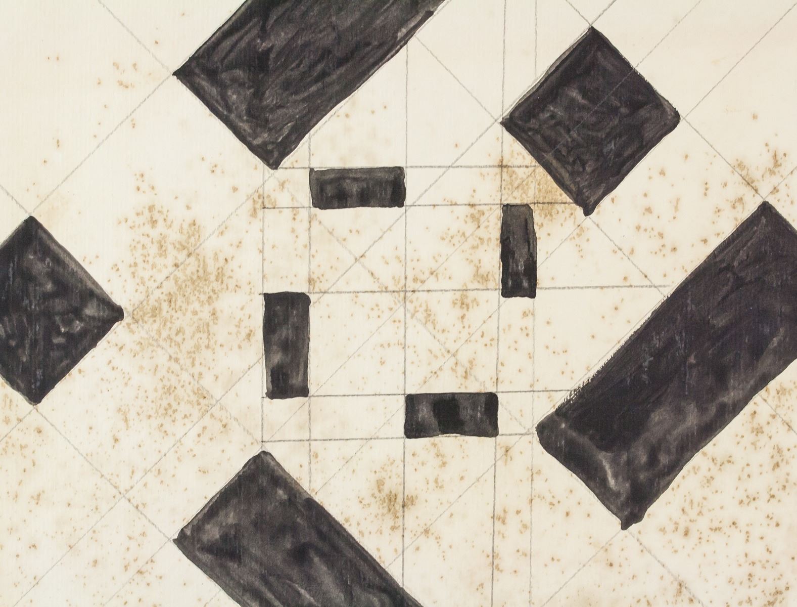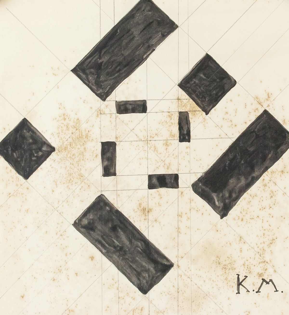 Mixed media on paper. Featuring black and white suprematist composition. Signed "K.M." in the bottom right corner. Attributed to Kazimir Malevich (1879-1935, Russian). 20.5 x 19 cm (7.75 x 7.5 in)
