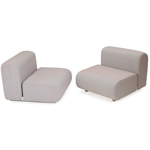 Kazuhide Takahama Suzanne lounge chairs, pair, by Knoll, upholstered slab seat and back with rounded top and front over chrome-plated steel bases, blue/gray fabric upholstery, unmarked, 30in.w x 34.5in.d x 25in.h,very good condition