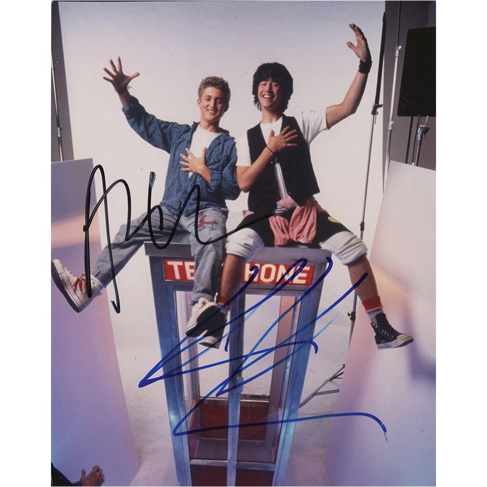 Color glossy 8 x 10 photo of Keanu Reeves and Alex Winter posing in a photo shoot for the 1989 film Bill & Ted's Excellent Adventure, signed in blue felt tip by Reeves and in black felt tip by Winter. In fine condition.