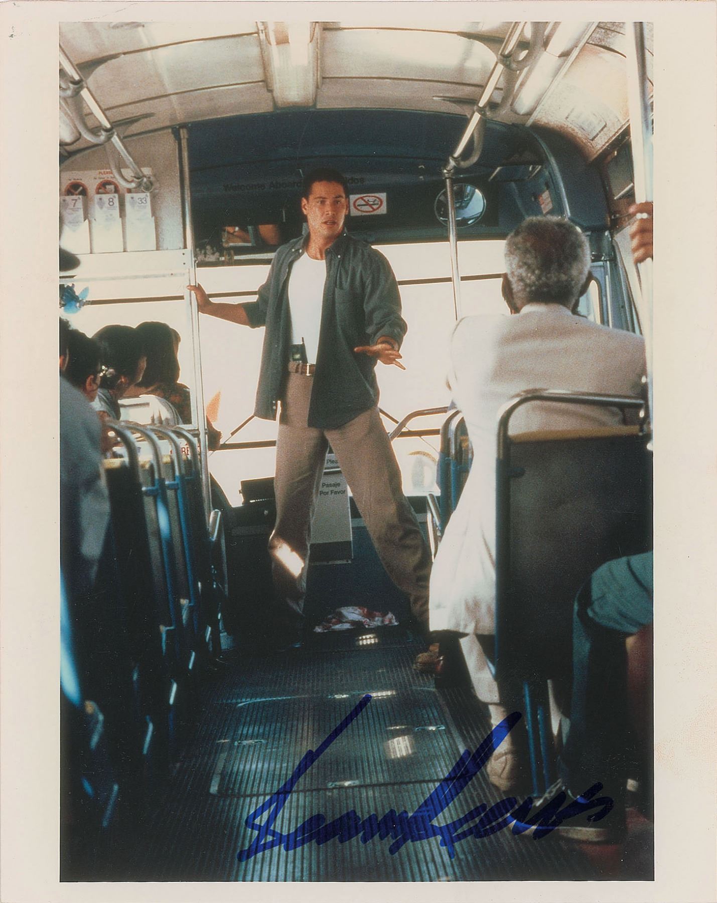 Color glossy 8 x 10 full-length photo of Keanu Reeves as heroic cop Jack Traven from the 1994 action flick Speed, signed in blue felt tip. In fine condition.