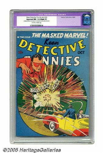 <B>Keen Detective Funnies V2#10 (Centaur, 1939) CGC Apparent NM- 9.2 Slight (P) Off-white to white pages.</B></I> This issue's cover, featuring the Masked Marvel, is by Ben Thompson, who's perhaps best known as the artist of Ka-Zar for the folks at Timely. CGC notes, "Restoration includes: small amount of color touch on cover; tear seals to cover." Overstreet 2005 GD 2.0 value = $75; VG 4.0 value = $150; FN 6.0 value = $225; VF 8.0 value = $469; VF/NM 9.0 value = $722; NM- 9.2 value = $975.