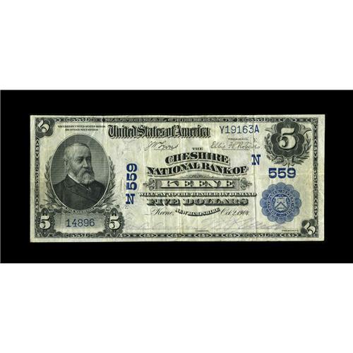 <B>Keene, NH</B></I> - $5 1902 Date Back Fr. 590 <B>The Cheshire NB</B></I> Ch. # (N)559<BR>A complete collection of the various issues from here would include 34 different types and denominations. This <B>Very Fine</B></I> addition to the census is just the second $5 Date Back to surface and demonstrates that within any bank population of survivors there can be individual types and denominations of considerable scarcity.