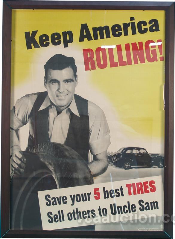 "Keep America Rolling" Poster Advertisement "Save Your 5 Best Tires Sell Others To Uncle Sam" Division Of Information Office For Emergency Management, in frame - 27" x 39"