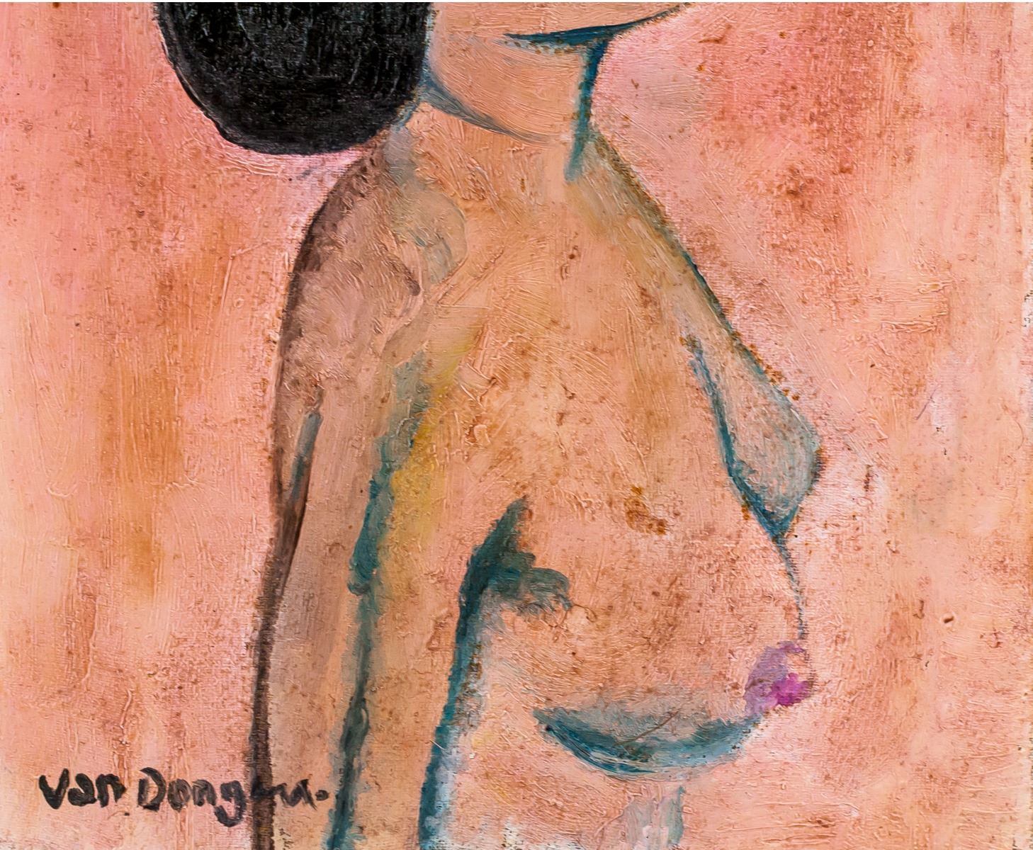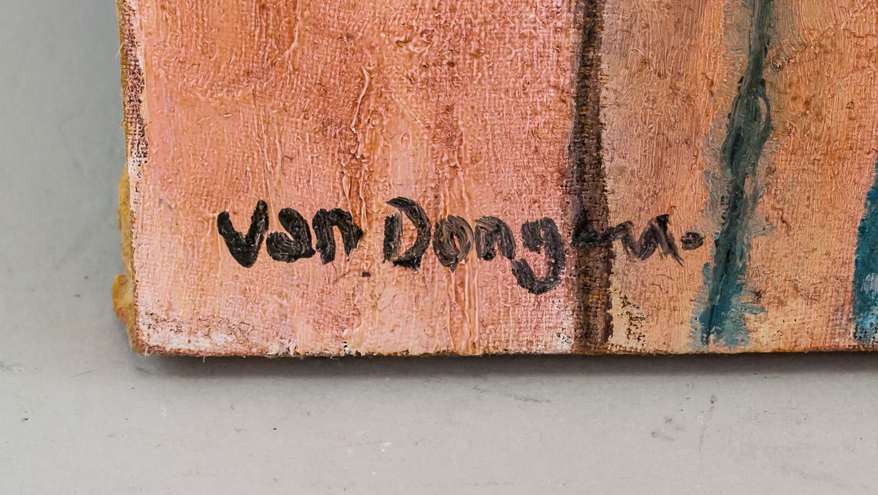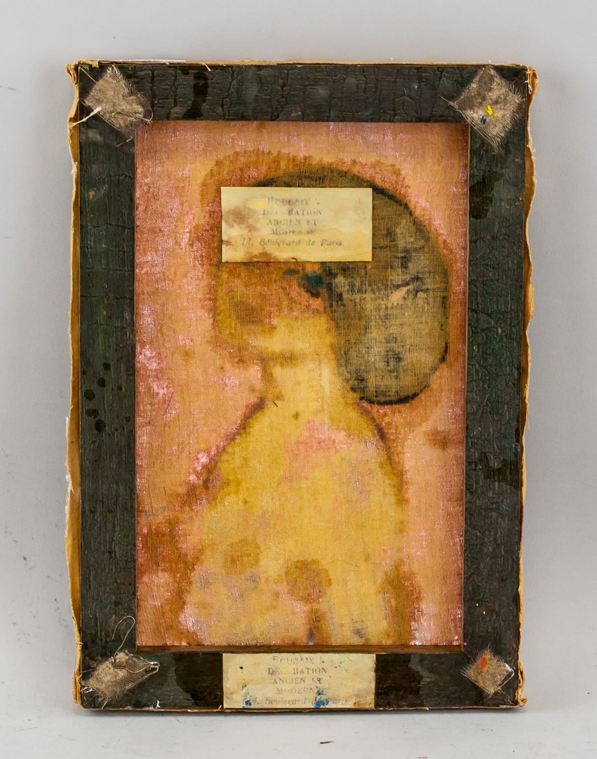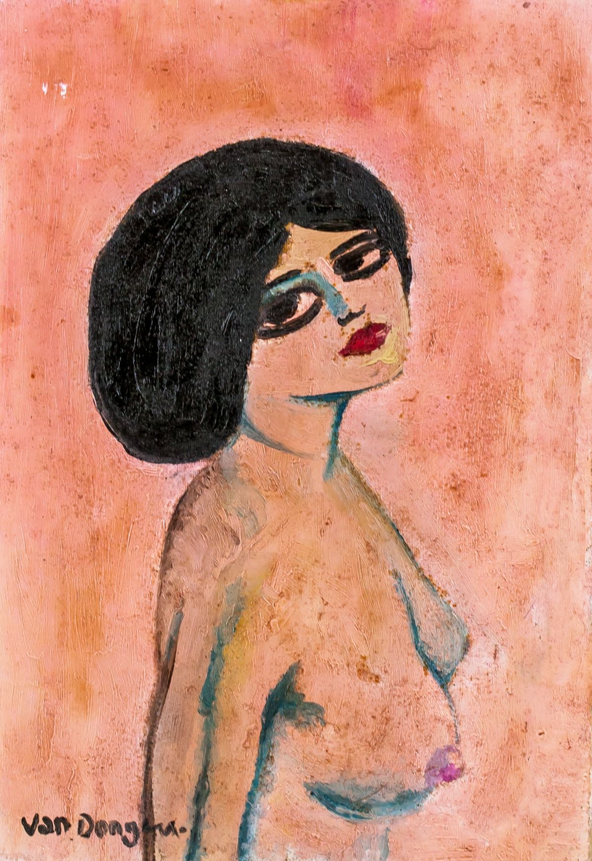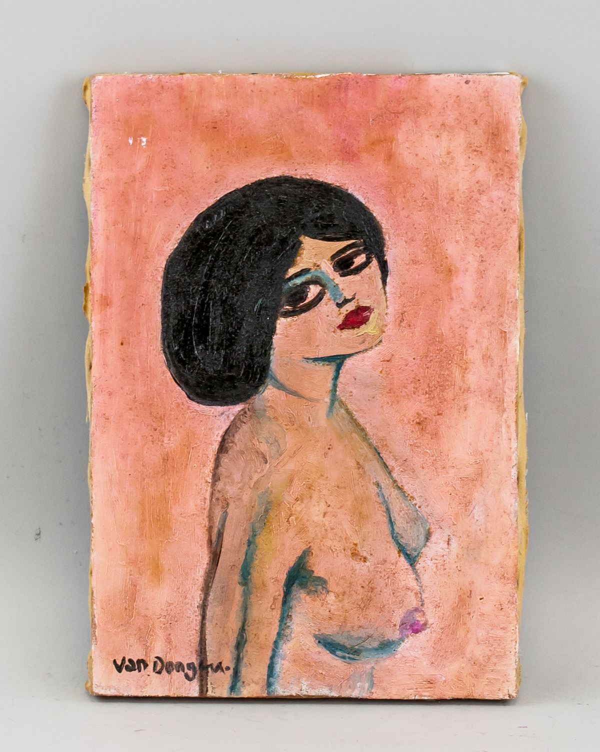 Oil on canvas. Featuring a nude portrait. Signed Van Dongen on the lower left corner. Label affixed to verso inscribed CUBAIX DECORATION ANCIEN ET MODERNE 14, Boulevarde de Paris. Another similar label affixed to verso on stretcher bar. Attributed to Kees Van Dongen (1877-1968, Dutch). 30 x 20 cm (12 x 8 inches)