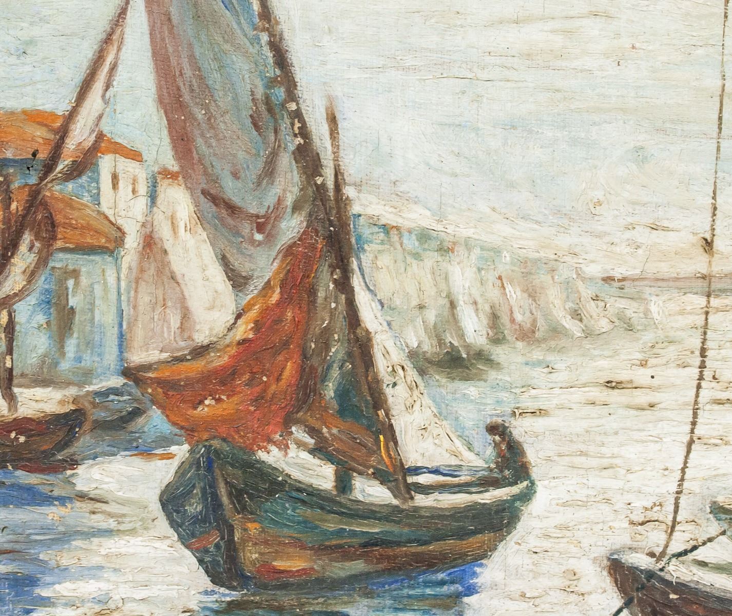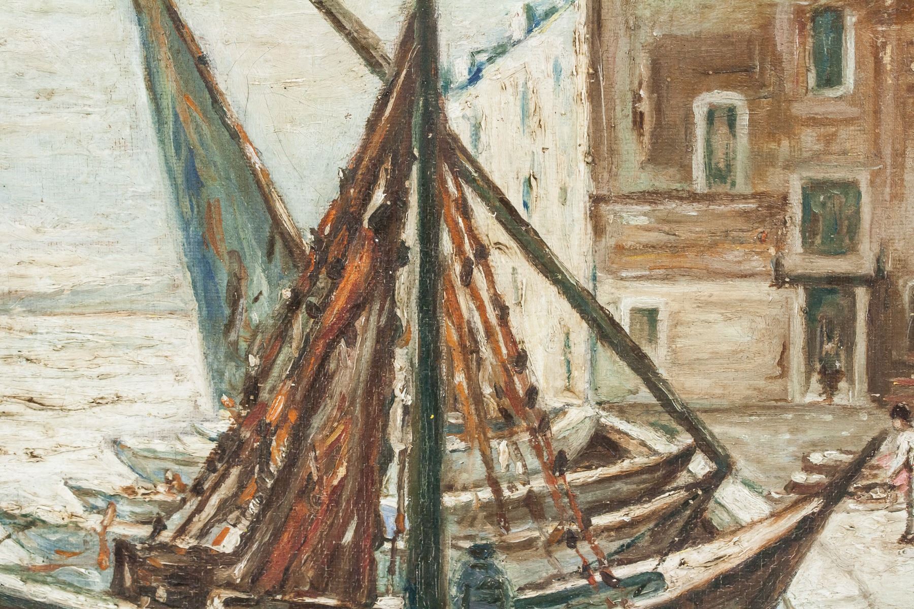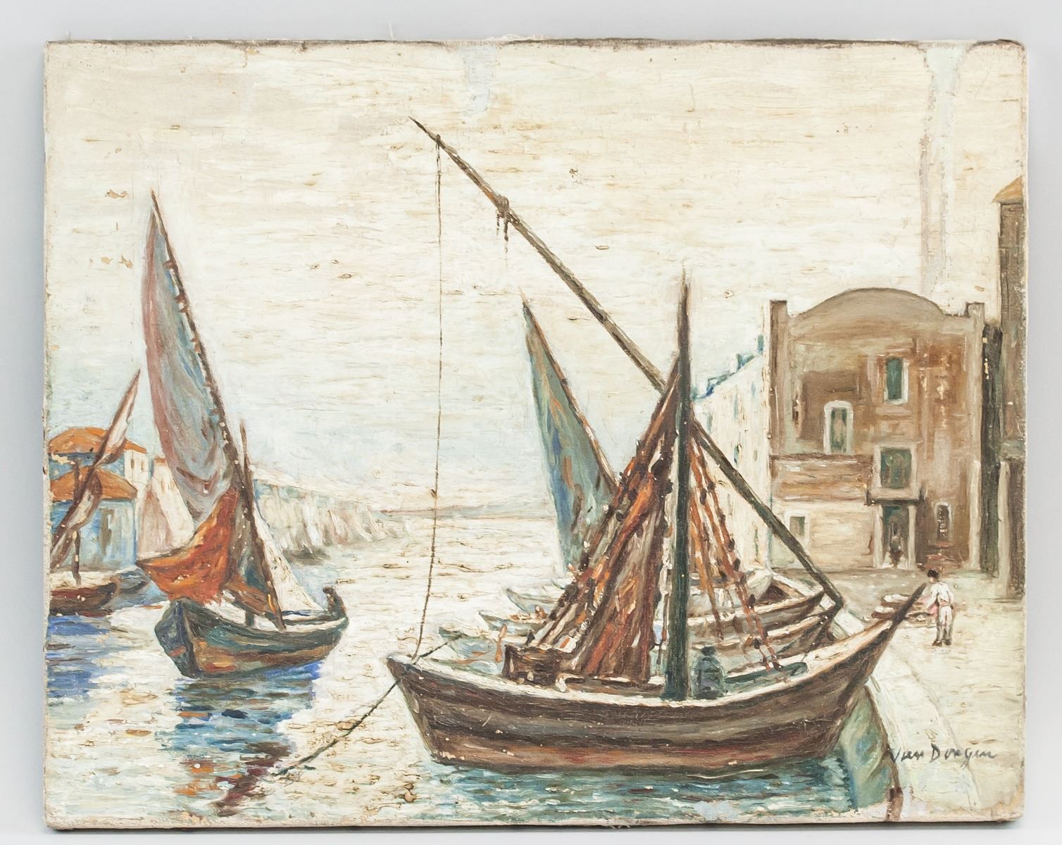 Oil on canvas. Featuring ships docked by the pier. Signed "Van Dongen" in the bottom right corner. Attributed to Kees Van Dongen (1877-1968, Dutch). 35 x 44 cm (14 x 17.25 inches). Provenance: This lot carries limited provenance from a Southern Ontario estate