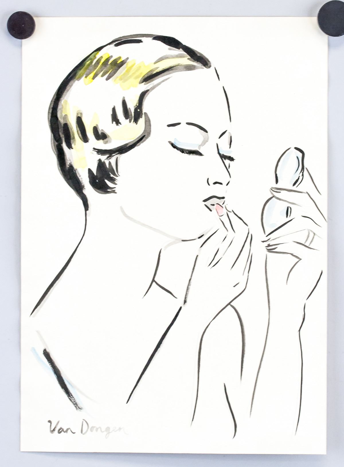 Ink and watercolor on paper. Featuring a portrait of a woman putting on lipstick. Signed Van Dongen on the lower left corner. Attributed to Kees Van Dongen (1877-1968, Dutch-French). 29.5 x 21 cm (11.5 x 8.25 in). PROVENANCE: This lot carries limited provenance from an Upper New York estate
