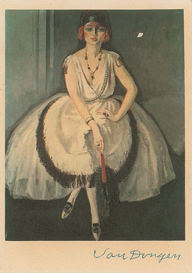 Dutch painter who was one of the leading Fauves (1877–1968). Color 4 x 5.75 postcard featuring van Dongen's painting 'La Femme a l'Eventail [Woman with a Fan],' signed in the lower border in blue ballpoint, "van Dongen." In fine condition, with a fleck of surface to the upper right background, and some old masking tape to the reverse edges.