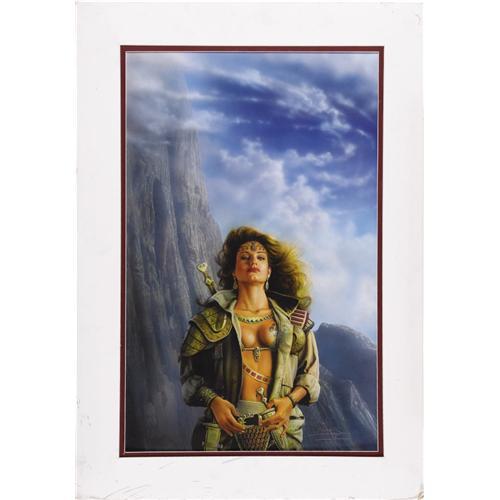 <B>Keith Birdsong - "Scorpianne" Paperback Cover Painting Original Art (New American Library, 1994).</B></I> A sultry <I>femme fatale </B></I>takes the limelight on this sensuous cover scene painted for Emily Devenport's sci-fi novel. A high-stakes game of interstellar technology and warfare is set against a backdrop of an interplanetary battle between Earth and Mars. This thriller focuses on one woman's determination to unravel the deadly secrets of illegal biotech research. This piece has an image area measuring 17.5" x 27", and the art is in Excellent condition.<BR><BR><b>Shipping:</b> Flat Material, Large (<a target="_blank" href="http://www.heritageauctions.com/common/shipping.php">view shipping information</a>)