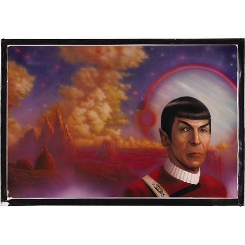 <B>Keith Birdsong - "Star Trek: Vulcan's Forge" Paperback Cover Painting Original Art (Pocket Books, 1997).</B></I> If you are a fan of Mr. Spock of "Star Trek" fame (and who isn't?), it would be <I>illogical</B></I> not to bid on this spectacular wraparound cover, painted for Josepha Sherman and Susan Shwartz's <B>Star Trek </B></I>novel. This fantastic piece has an image area measuring 30" x 20.5". Aside from some edge wear and a few dings on the corners of the art board, the art is otherwise in Excellent condition. Bid, live long, and prosper!<BR><BR><b>Shipping:</b> Flat Material, Large (<a target="_blank" href="http://www.heritageauctions.com/common/shipping.php">view shipping information</a>)