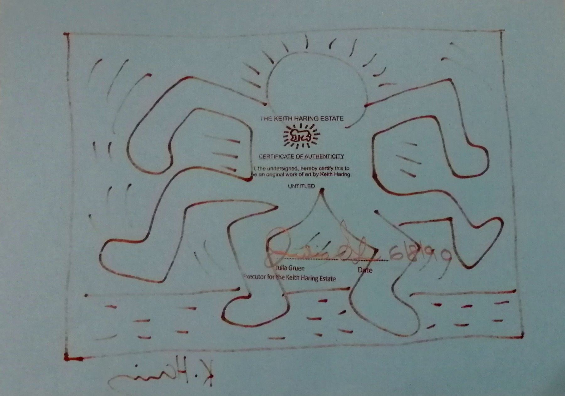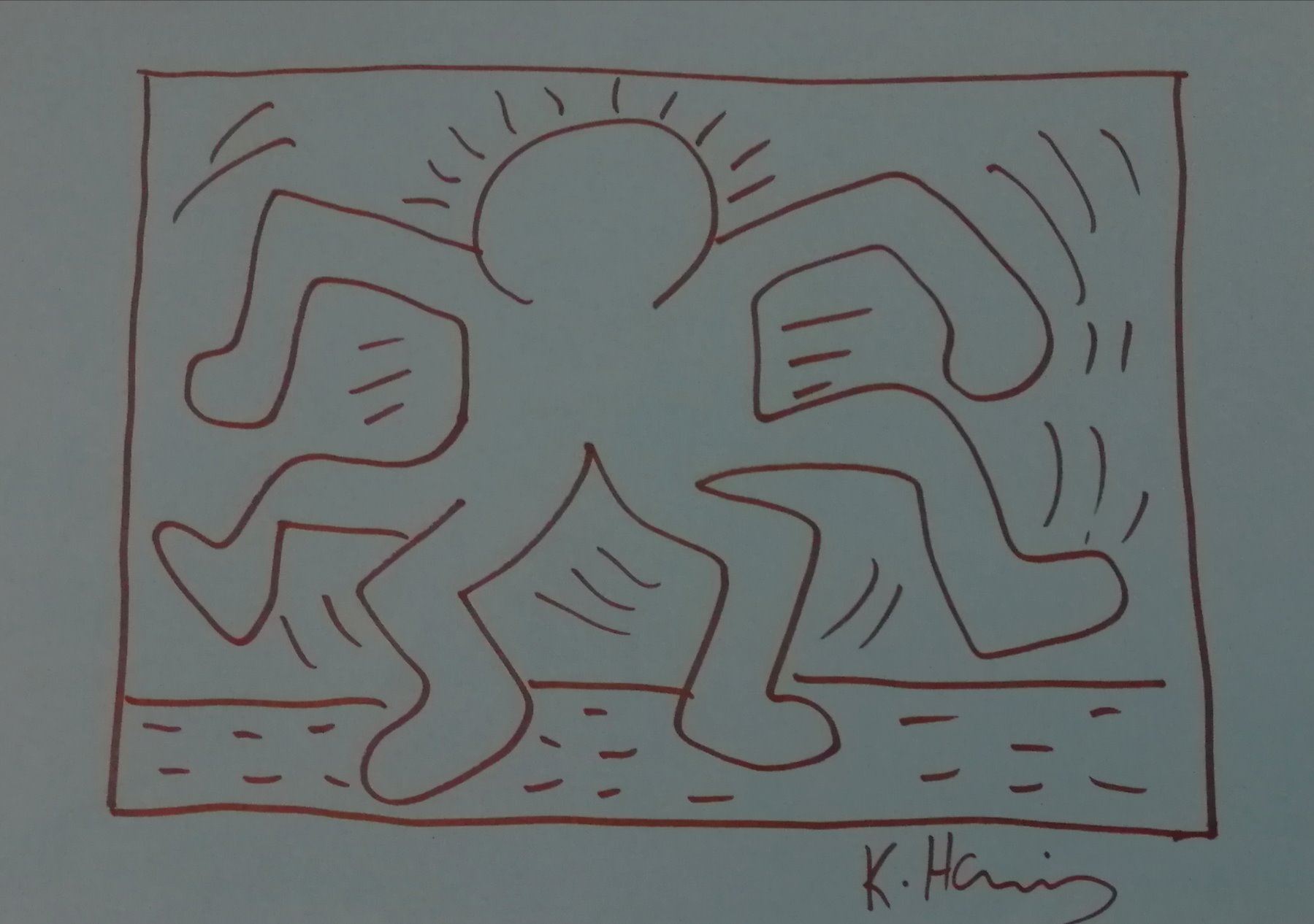 A drawing in sharpie of an 'Octopus man' on A4 blue paper, signed by Keith Haring, mounted and framed, and stamped on verso by the estate of Keith Haring.