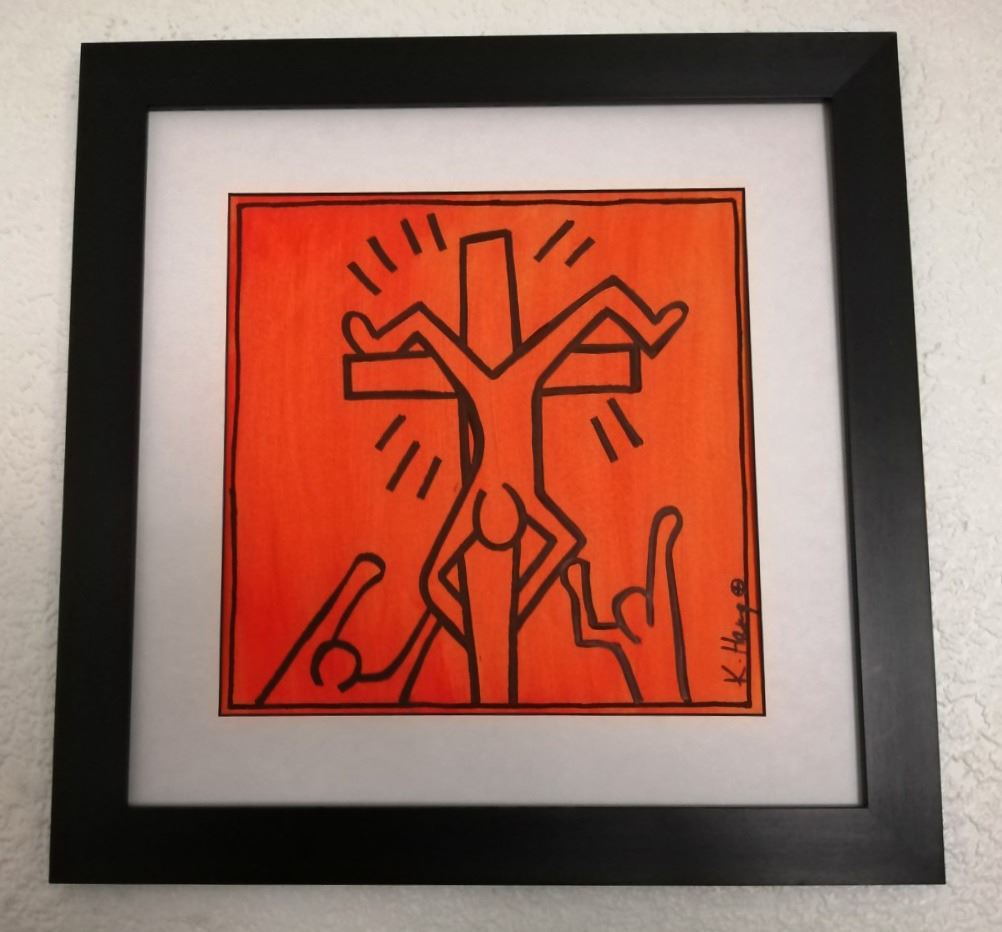 Adept at critiquing modern culture through symbols he employed, Haring often showed the cross as a place of death or being used by people to commit murder. The cross seen here can be said to represent evangelical Christianity and the trend toward televangelism that swept the US in the early 1980s. In interviews, the artist warned of the danger of dogmatism and "control religions."