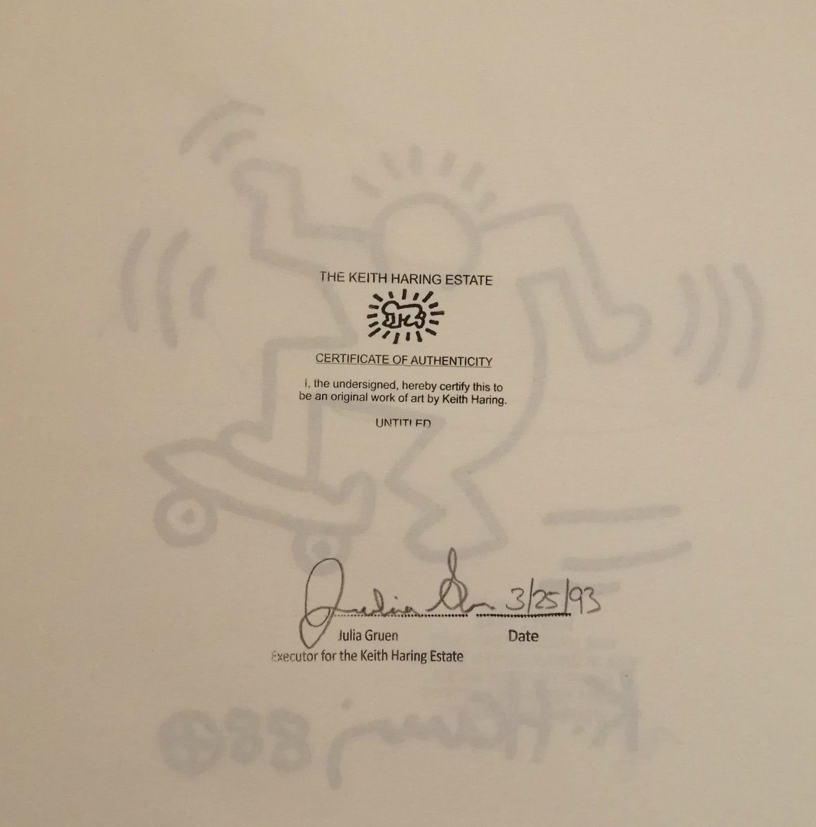 Rendered in sharpie, signed by Keith Haring, and stamped by the estate of Keith Haring on the verso. It's also mounted and framed.