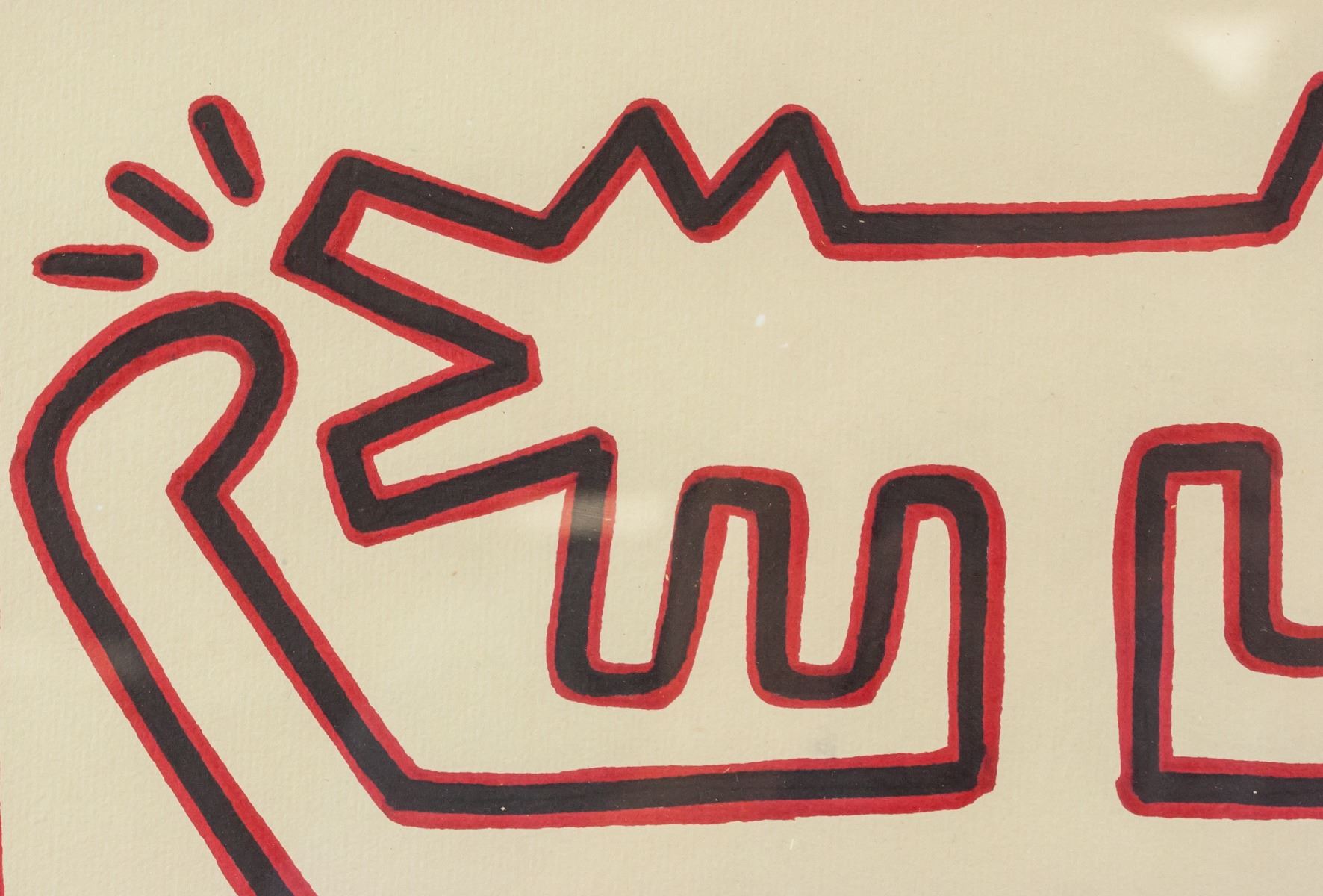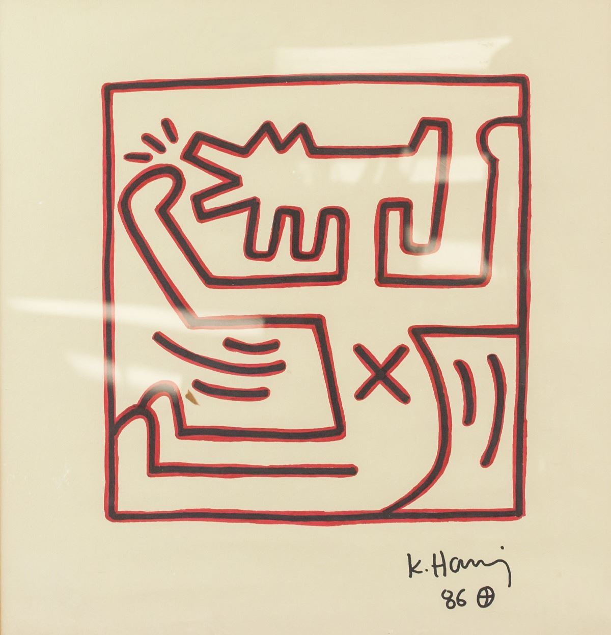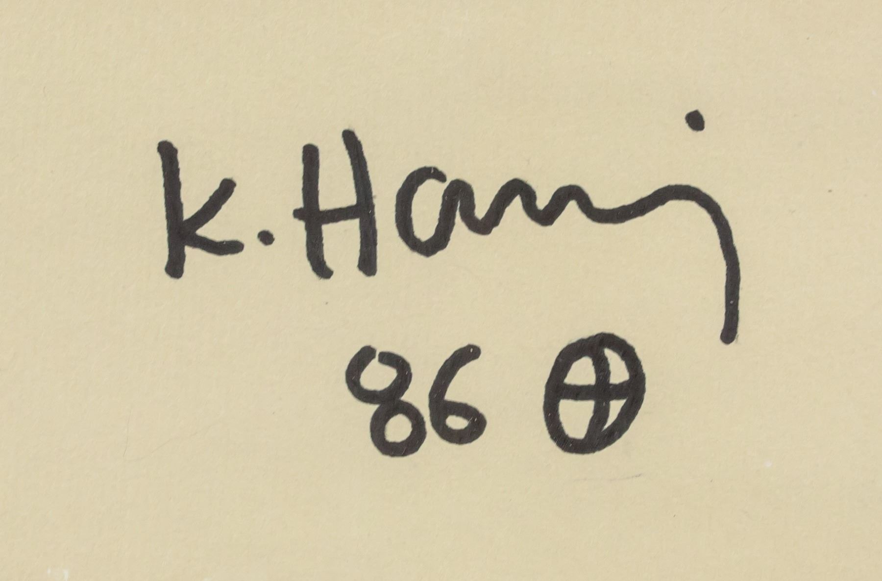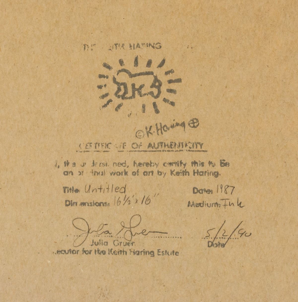 Marker on paper, framed. Featuring abstract human figure. Signed "K. Haring" on the bottom right corner, inscribed with "86" beneath signature. Partially legibly stamp on verso reads "[illegible] K. Haring CERTIFICATE OF AUTHENTICITY [illegible] hereby certify this to be an original work of art by Keith Haring Title Untitled Date 1987 Dimensions 16 1/2" x 16" Medium Ink Julia Gruer Executor for the Keith Haring Estate Date 5/2/90". Sticker affixed to verso reads "TONY SHAFRAZI GALLERY Keith Haring Untitled Marker on Board 16 1/2" x 16" #0281 130 PRINCE STREET NEW YORK NY 10012 TEL 212 271 9300 FAX 334 9499". Attributed to Keith Haring (1958-1990, American). 42 x 40 cm (16.5 x 15.75 inches). Framed size: 63 x 62 cm (24.75 x 24.5 inches). PROVENANCE: This lot carries limited provenance from a Southern Ontario estate