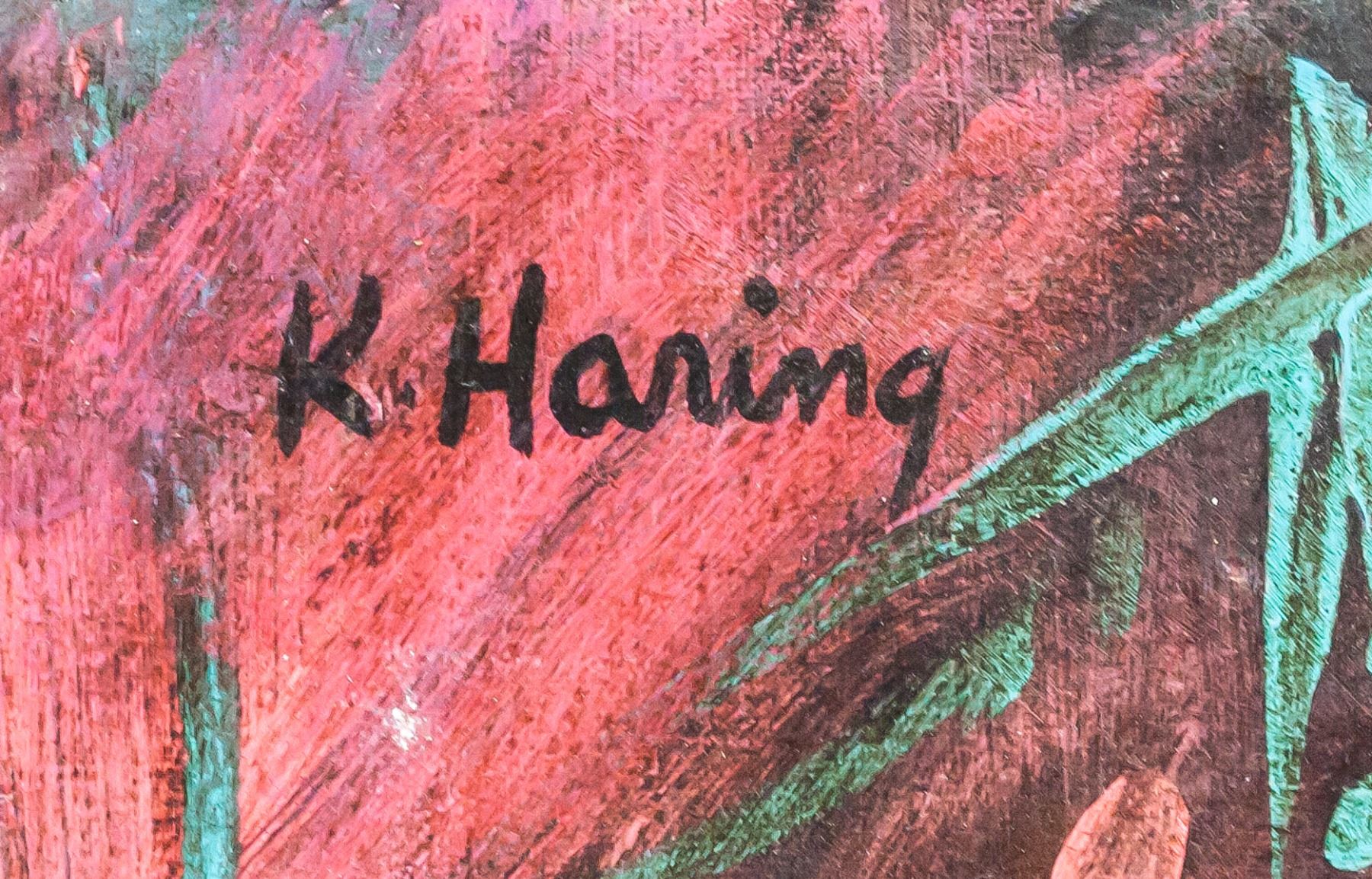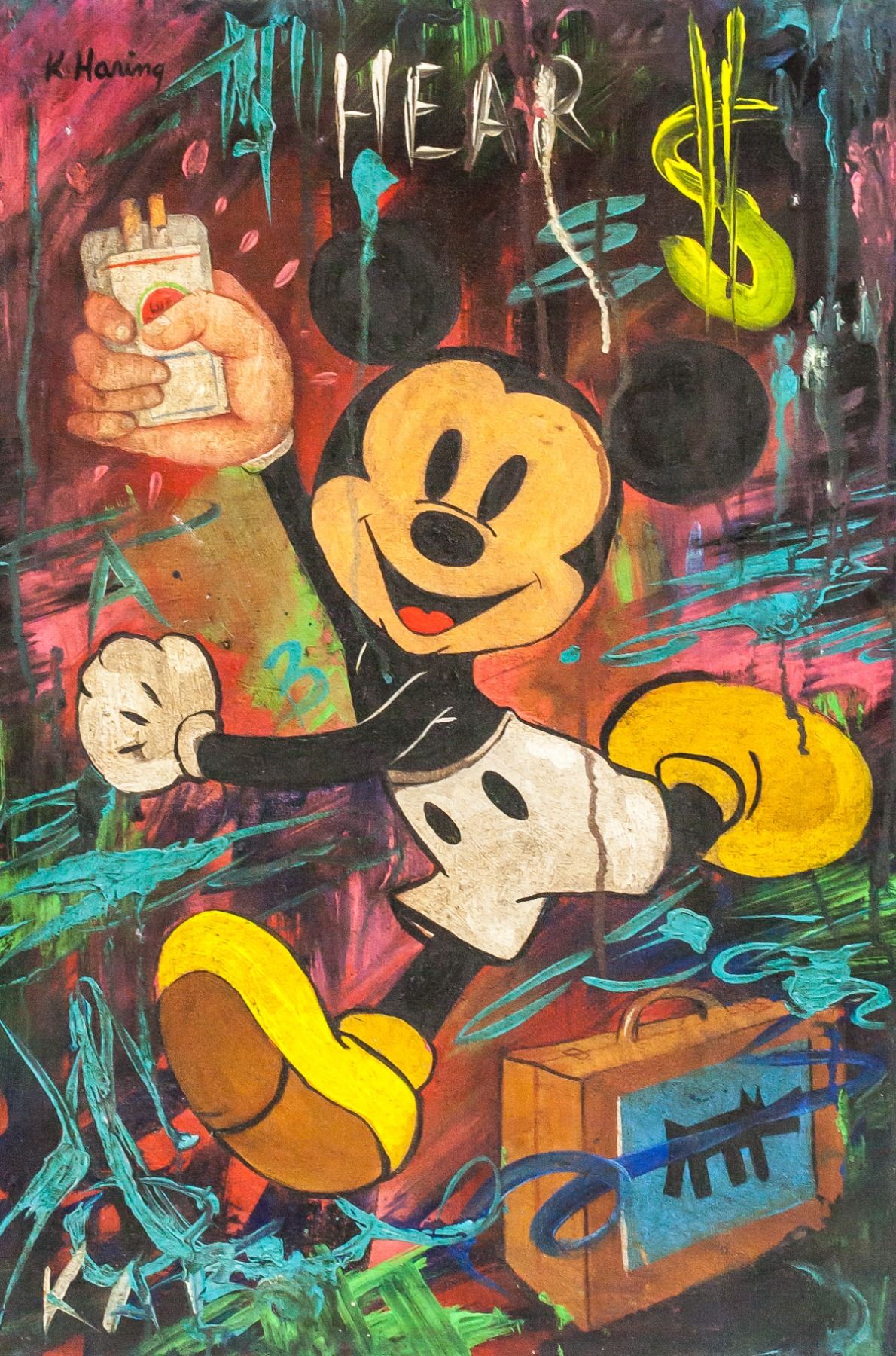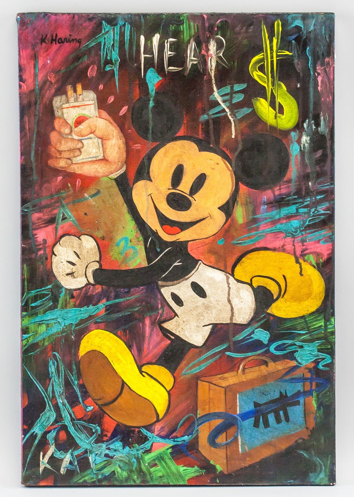 Oil on canvas, stretched. Featuring Mickey Mouse holding a pack of cigarettes. Signed K. Haring on the upper left corner. Stamped Art Gallery New York / 530 West 25th Street / New York, Ny 10001 on verso. Stamped on verso and inscribed "AUTHORIZED BY THE ESTATE OF KEITH HARING". Attributed to Keith Haring (1958-1990, American). Canvas: 59 x 39 cm (23 x 15.5 inches). Provenance: This lot carries limited provenance from a Southern Ontario estate
