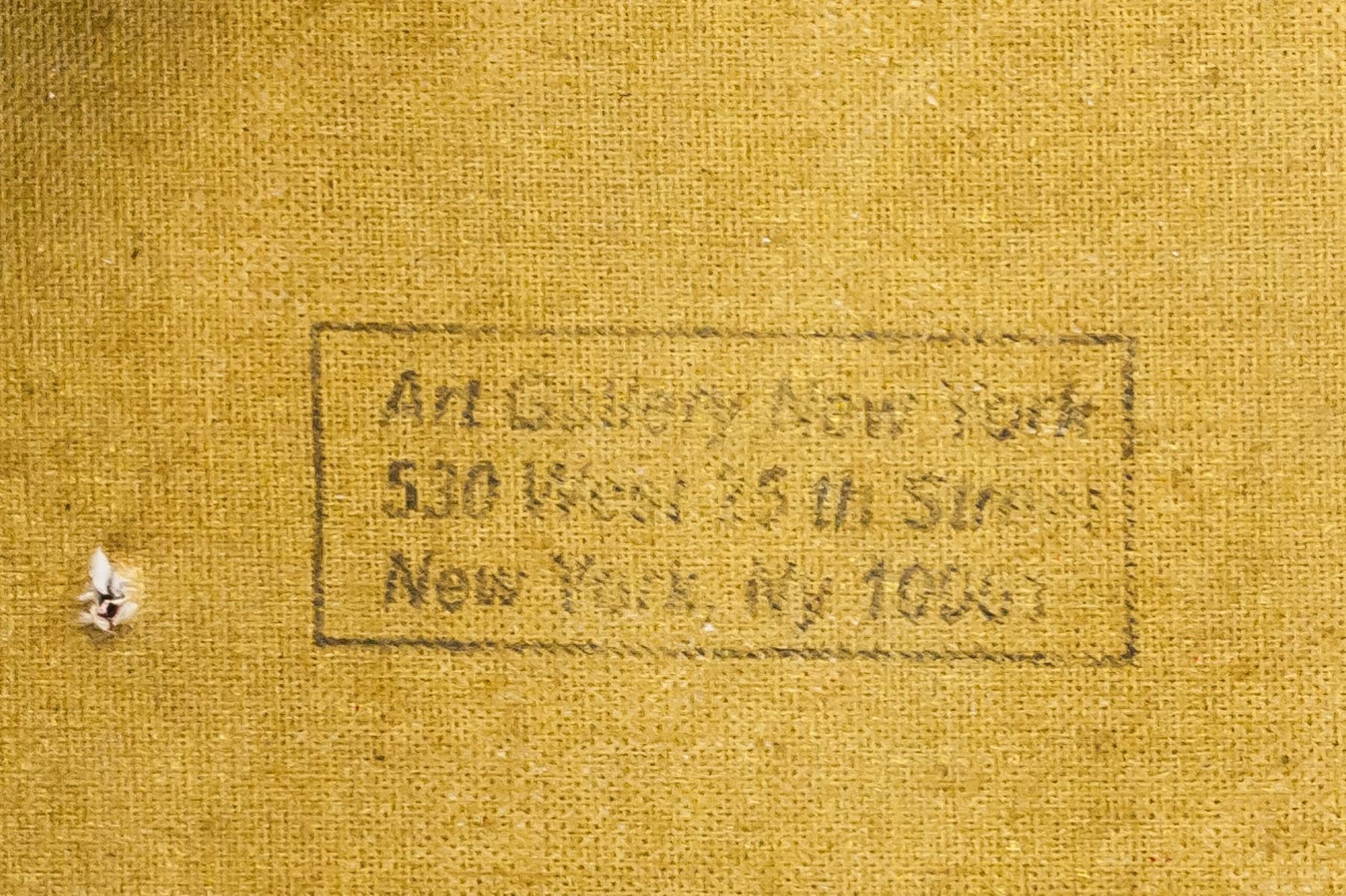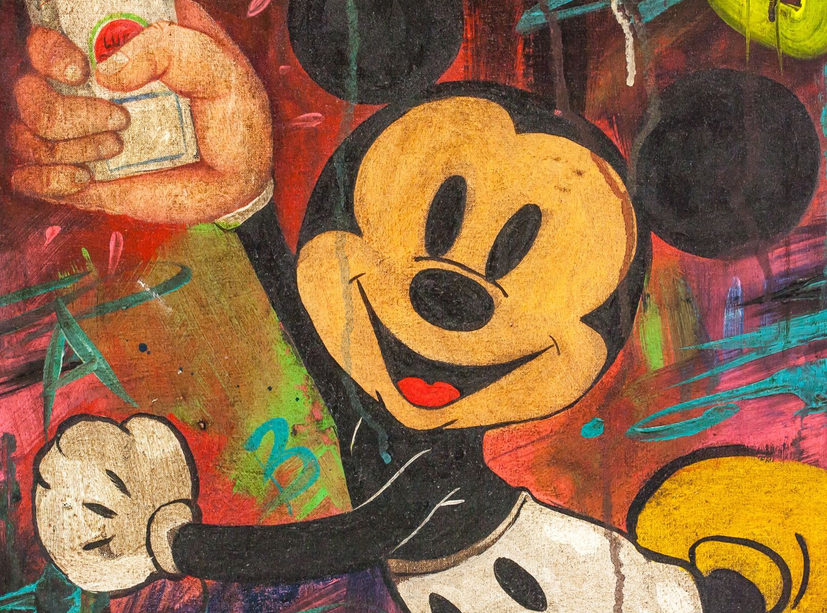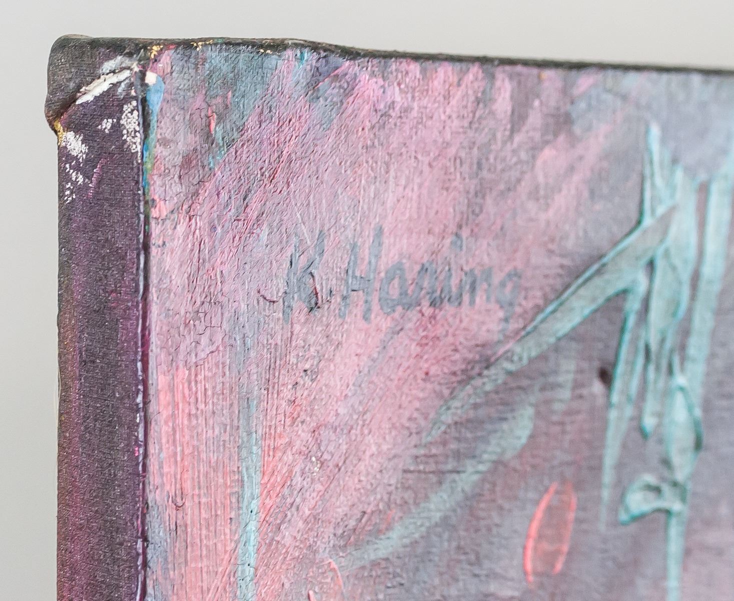 Oil on canvas, stretched. Featuring Mickey Mouse holding a pack of cigarettes. Signed K. Haring on the upper left corner. Stamped Art Gallery New York / 530 West 25th Street / New York, Ny 10001 on verso. Stamped on verso and inscribed "AUTHORIZED BY THE ESTATE OF KEITH HARING". Attributed to Keith Haring (1958-1990, American). Canvas: 59 x 39 cm (23 x 15.5 inches). Provenance: This lot carries limited provenance from a Southern Ontario estate