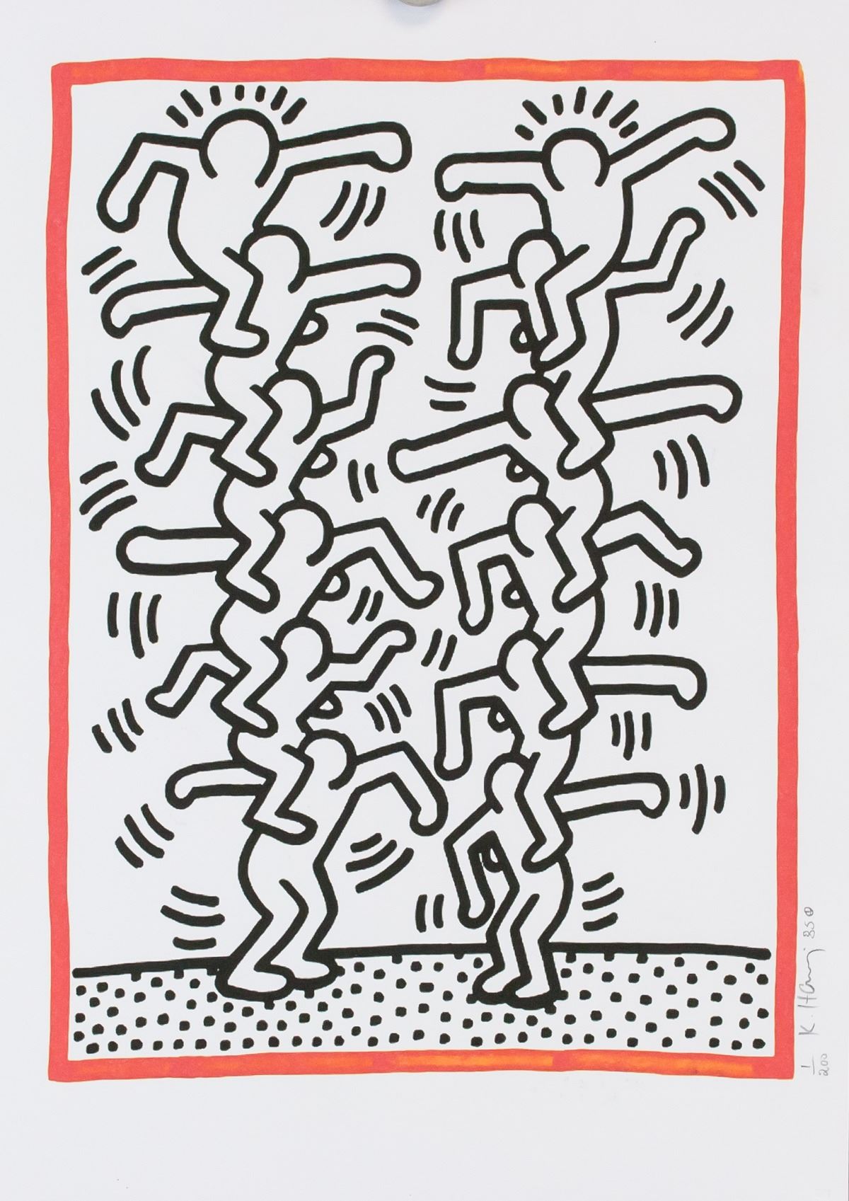 Lithograph on paper. Featuring figures atop one another. Signed K. Haring and inscribed 1/200 and '85 on the lower right corner. Inscribed Keith Haring - Untitled (People Ladder), 196 - edition 1/200 on verso. Attributed to Keith Haring (1958-1990, American). 45 x 32 cm (18 x 12.75 inches). Provenance: This lot carries limited provenance from a Southern Ontario estate